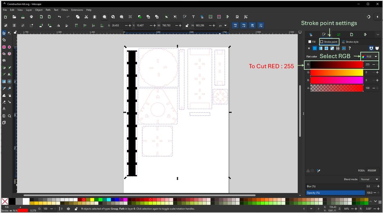 - Red (RGB 255,0,0) stroke for cutting paths