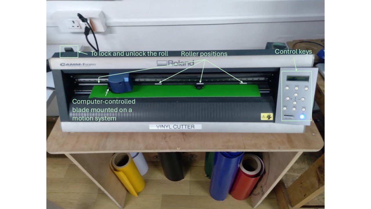 Vinyl cutting is a digital fabrication process that allows us to cut 2D designs and vector graphics from vinyl sheets. A vinyl cutter uses a tiny computer-controlled blade (like a super sharp pen) to cut thin materials such as: