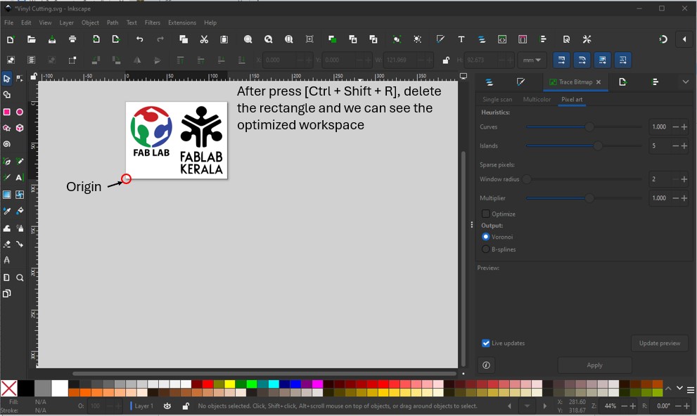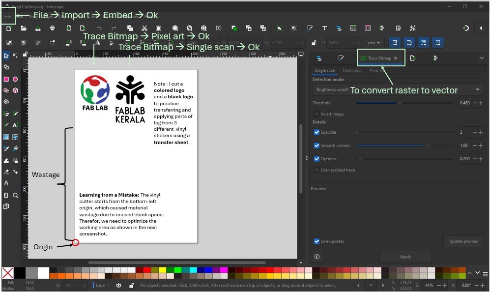 First, I created three separate SVG files, since the Fab Academy logo contains three different colors, each requiring a separate vinyl cut. I downloaded the logo in PNG format and used Trace Bitmap (Shift + Alt + B) in Inkscape to convert the raster image into a vector file. After converting, I scaled each logo to 5 cm × 5 cm and arranged them side by side.