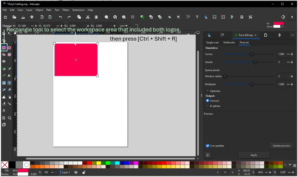 Learning from a Mistake: When sending this SVG file first time to the Roland vinyl cutter, it resulted in wasted vinyl material because the machine takes the bottom-left corner as the origin and cuts from bottom to top. This caused the unused blank area in between to be processed unnecessarily. To avoid material wastage, the design needs to be repositioned and optimized within the working area using [Ctrl+Shift+R], as shown in the next screenshot. Then save the files in SVG format.