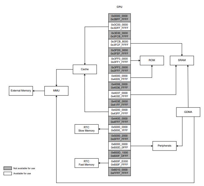 Memory Organization - below image illustrates the address mapping structure of ESP32-S3