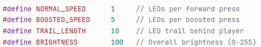 Prompt 11: Can you divide hill length in two parts up and down, when up you can keep 0.5 and while going down you can keep 2 . and also for example if RED player finishes first then 300th LED shall be RED, if green player finishes 2nd then 299th LED shall be lit up green and BLUE reached last then BLUE LED shall be lit up on 298th position. I need one improvement that when RED , GREEN and BLUE enters HILL1 or SPIRAL1 or SPIRAL2 the RED shall have RED color the GREEN shall have GREEN color and BLUE shall have BLUE color, currently what is happening is that he HILL and SPIRAL color are getting mix-up and creating new COLOR instead of RED, GREEN and BLUE. In the beginning, when you are blinking only the first LED 3 times, instead blink the whole track in white with 3 times. What name shall I give to this game?