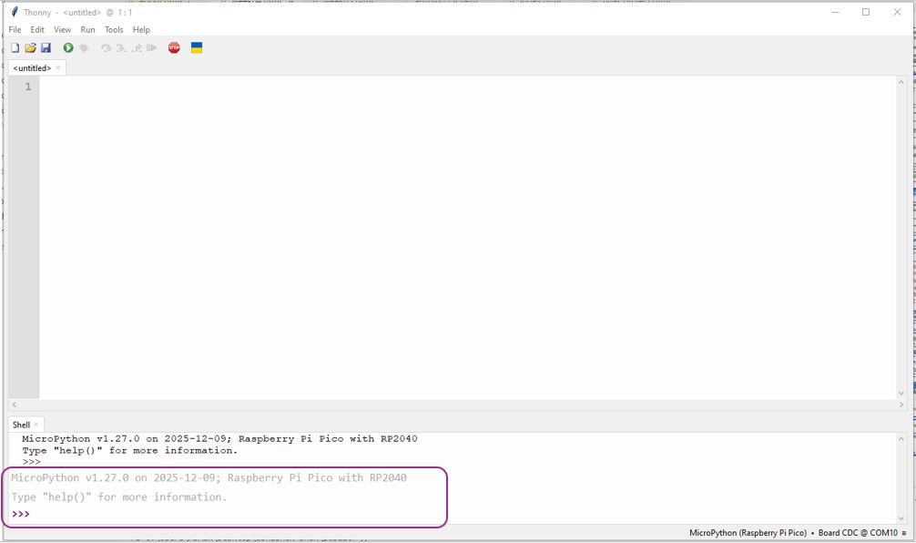 First, I downloaded and installed the latest version of Thonny for my operating system and launched the IDE. I then navigated to Tools โ Options โ Interpreter, where I selected MicroPython (Raspberry Pi Pico) as the interpreter and set the port to Try to detect automatically. Next, I pressed and held the BOOT button while connecting the board to my PC using a USB Type-C cable, after which the โRPI-RP2โ drive appeared, confirming that the board had entered bootloader mode. I returned to Tools โ Options โ Interpreter and clicked Install or Update MicroPython, allowing Thonny to automatically detect the device. Under the version selection, I chose Raspberry Pi Pico / Pico H, clicked Install, and closed the window once the status showed Done. The firmware completion message then appeared in the interface as shown below.