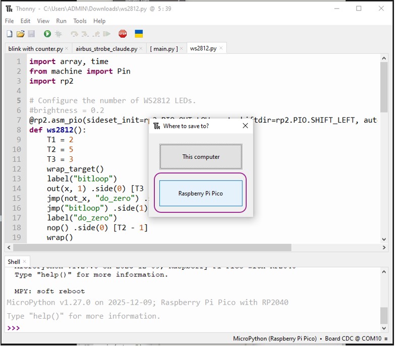 Now, the development environment was ready for coding. The first MicroPython program I tested was taken from the example provided for the onboard NeoPixel LED on the Seeed Studio wiki page. Since controlling the NeoPixel requires a third-party library, I downloaded the ws2812.py file. In Thonny, I then navigated to File โ Open, selected the downloaded ws2812.py file, and saved it to the board by choosing Raspberry Pi Pico as the target location (ensuring the filename remained ws2812.py).