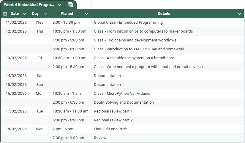 We received Seeed Studio XIAO RP2040, LEDs, Jumper wires, and Breadboard. We learned Pinout layout and breadboard layout.