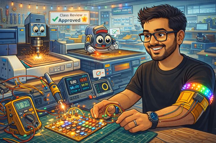 AI prompt: "can you give me my avatar an animated landscape image (I don't want realistic image)- where in I am making Charlieplexing PCB, I milled 2 layer PCB, used fiber optical laser to cut kapton tape then used Kapton tape for 3rd layer. The image should depict the I am doing digital fabrication and Programming/Coding and Testing 5 X 4 LED charlieplexing matix."