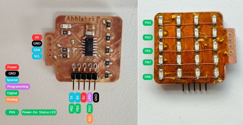 I designed a microcontroller board using ATTiny 1624 and LED Matrix of 5 Rows and 4 Columns as (n) x (n-1). The Charlieplexing concept states that I can control (n) x (n-1) LEDs using n pines of a micro-controller. Thus, here I can control 20 leds using 5 pins of micro-controller ATTiny 1624 IC.