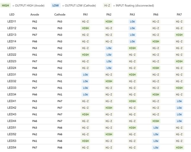 pinMode(CHARLIE_PINS[i], INPUT); // INPUT = Hi-Z = electrically disconnected