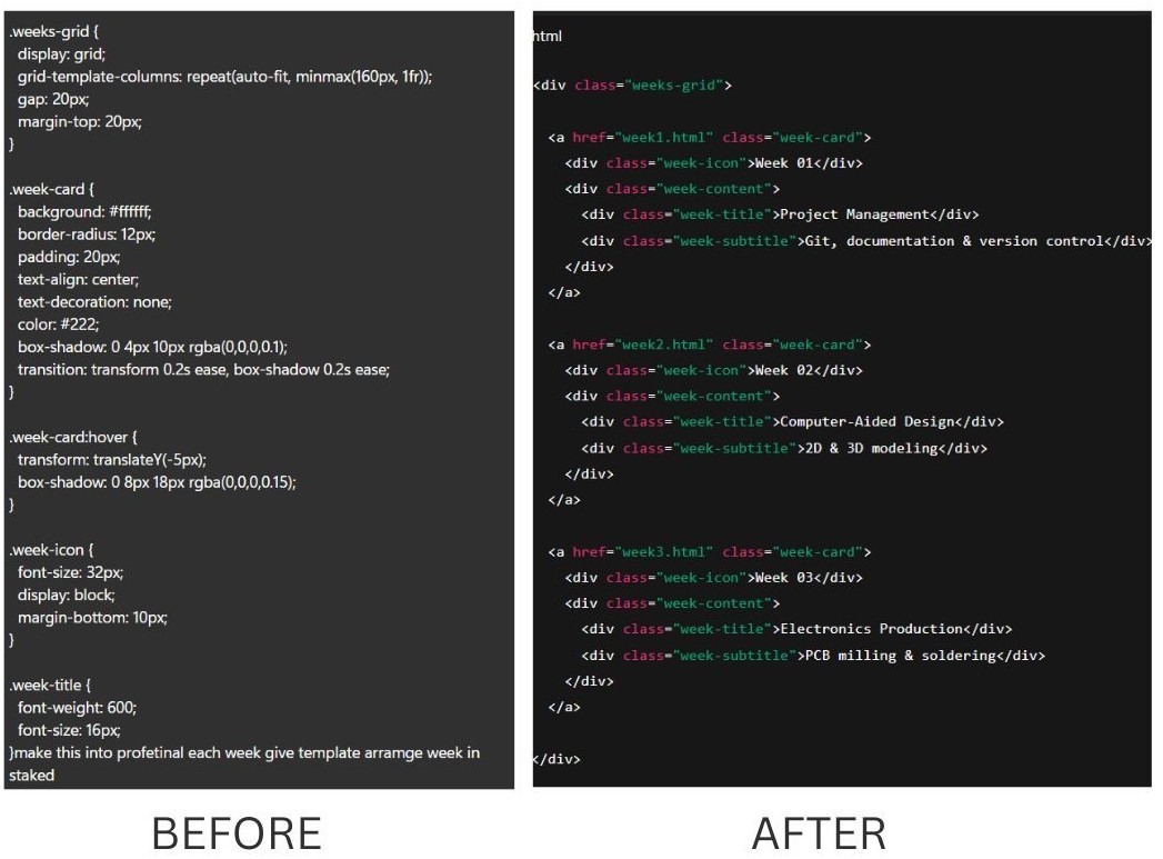 "The screenshot below demonstrates the layout and design improvements made to the website using the above HTML and CSS, highlighting the 'before' and 'after' states."