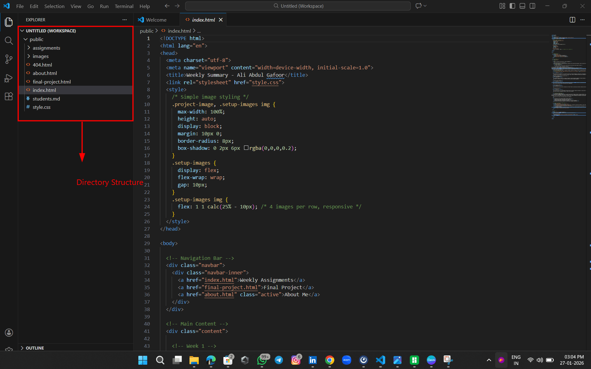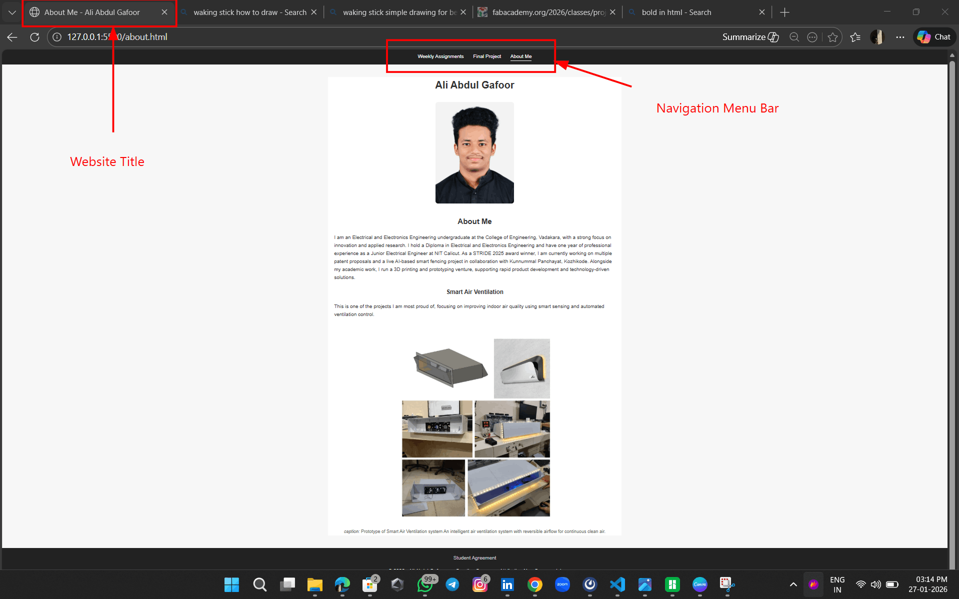 I organized the project files into a structured directory that includes separate folders for CSS, images, and JavaScript, along with the main HTML pages. The index.html file serves as the home page, while about_me.html contains personal information. The CSS folder holds the stylesheet used for UI design, and the images folder contains the Fablab Kerala logo and favicon. Using references from w3schools and my prior HTML experience, I developed a home page with the required navigation menu and linked pages.