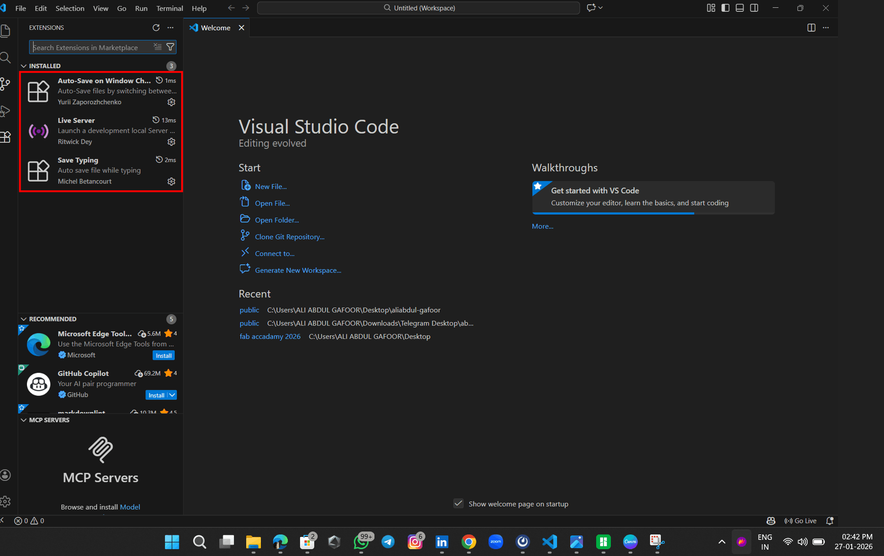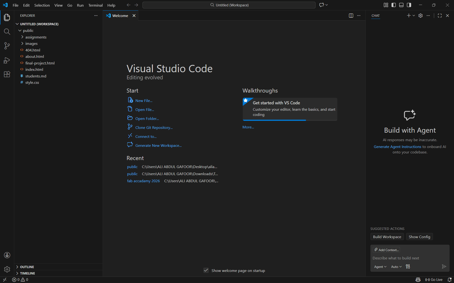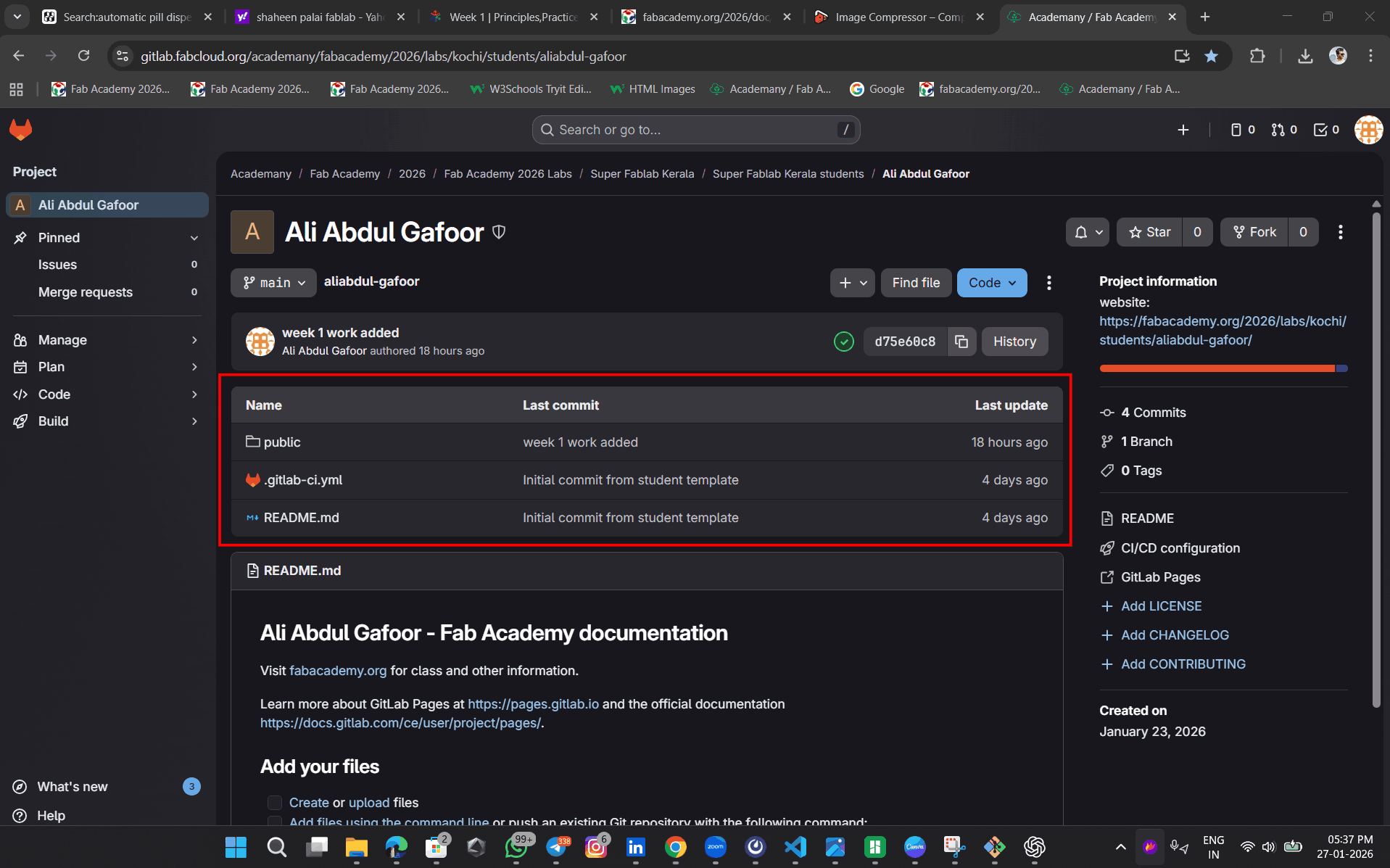 The entire Fab Academy documentation is written and presented through a website, allowing students to experience real-world online web documentation while improving their web development skills. As part of this week’s assignment, we focused on creating a basic website and uploading it to a GitLab repository. The Fab instructors recommended using a Linux operating system, as it is generally more suitable for this course. However, for my setup, I used Windows OS. There are many text editors available for web development, such as Brackets, Visual Studio Code, and others. In this tutorial, I am using Visual Studio Code (VS Code). VS Code is one of the most popular code editors, offering a wide range of extensions and features that make web development easier. It is a Microsoft product and works smoothly on Windows, Linux, and macOS. The installation process for VS Code is straightforward, and it provides an efficient environment for writing and managing web development projects.During the first week, the following setups were completed: