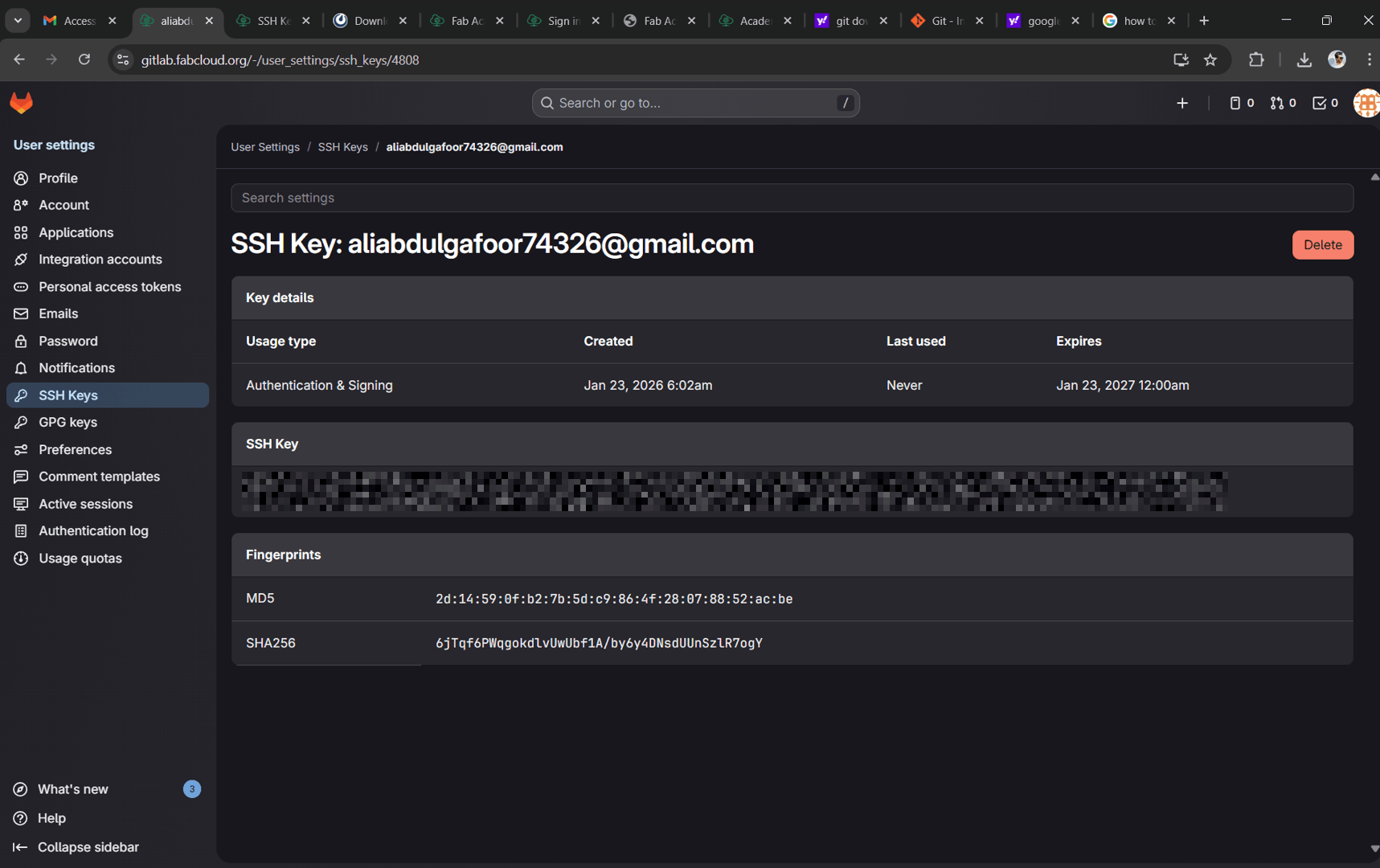 This is the GitLab repository SSH URL used to clone the Fab Academy project repository. It provides secure access to the remote repository, allowing files to be cloned, updated, and synchronized between the local system and the FabCloud GitLab server.