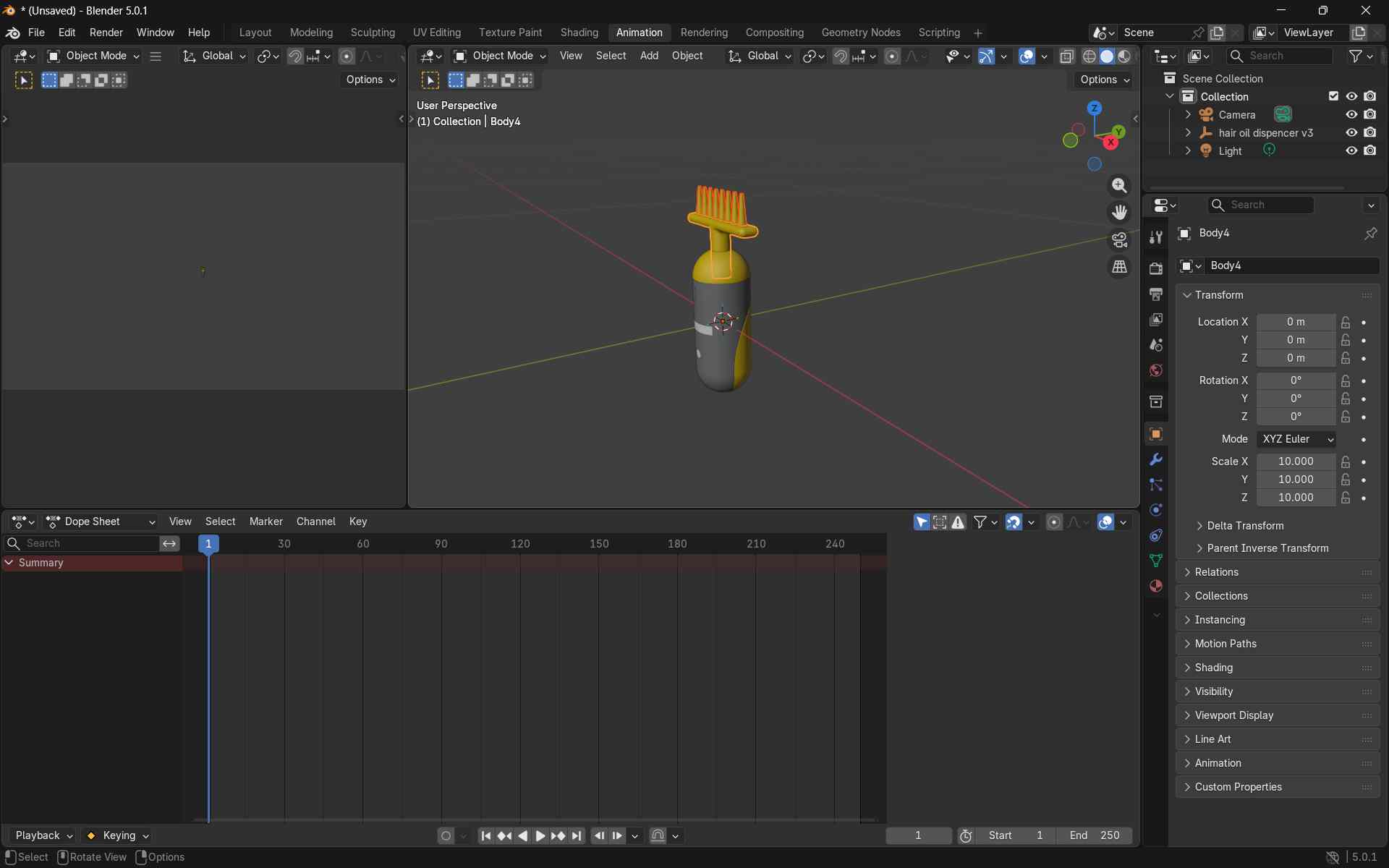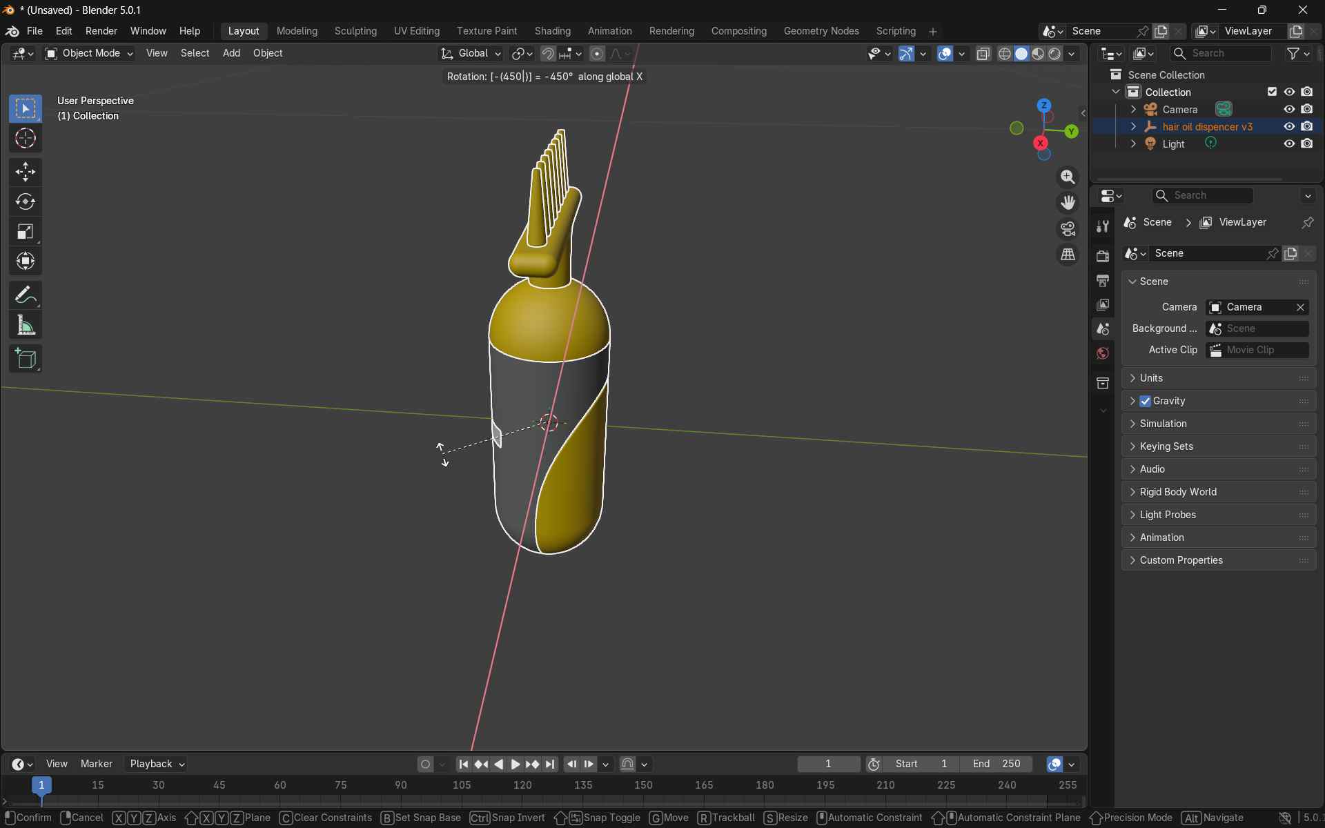 I proceeded to create a 3D model of my proposed final project, the hair oil dispenser, applying the tools and techniques learned during the exercise.