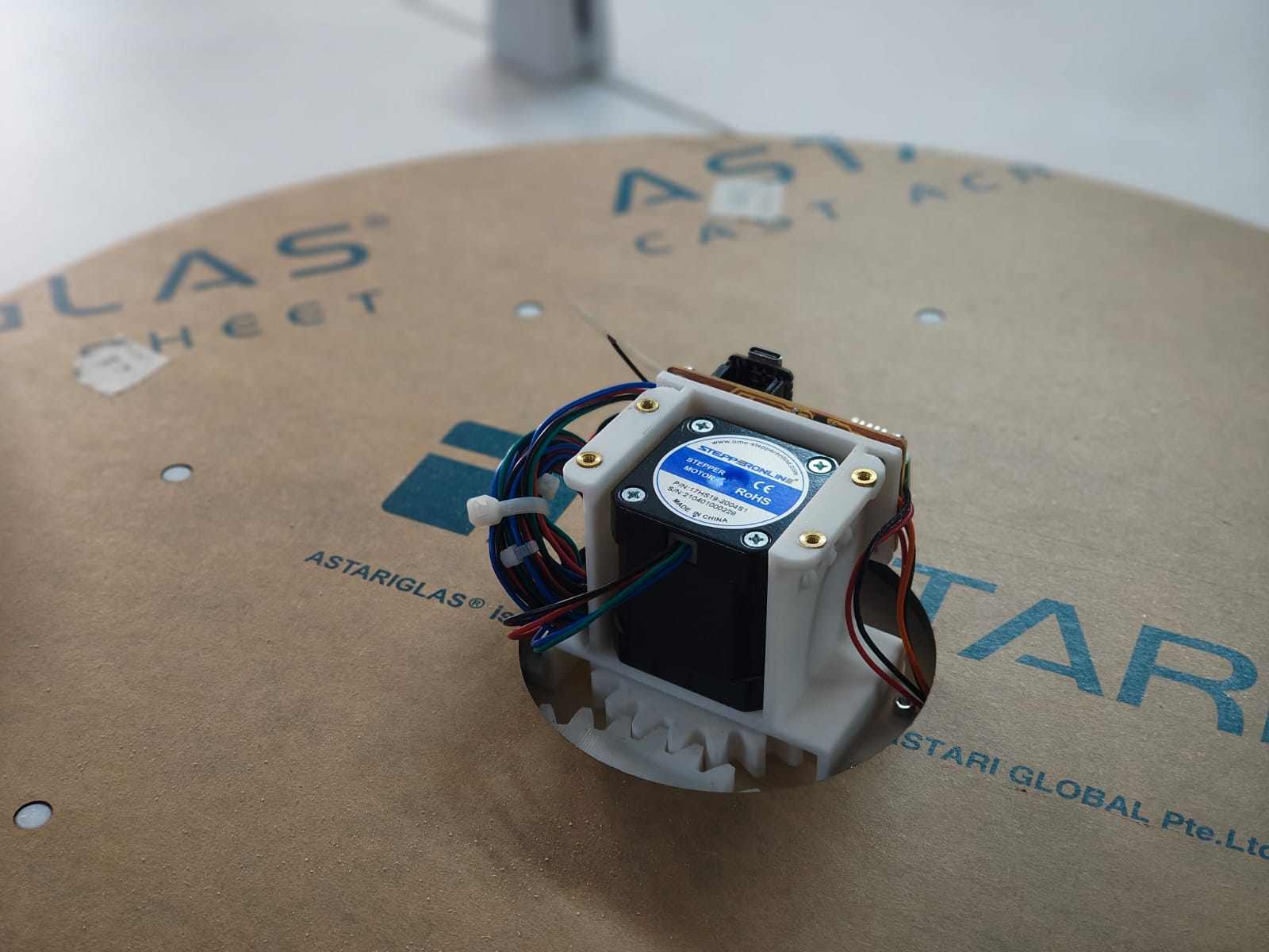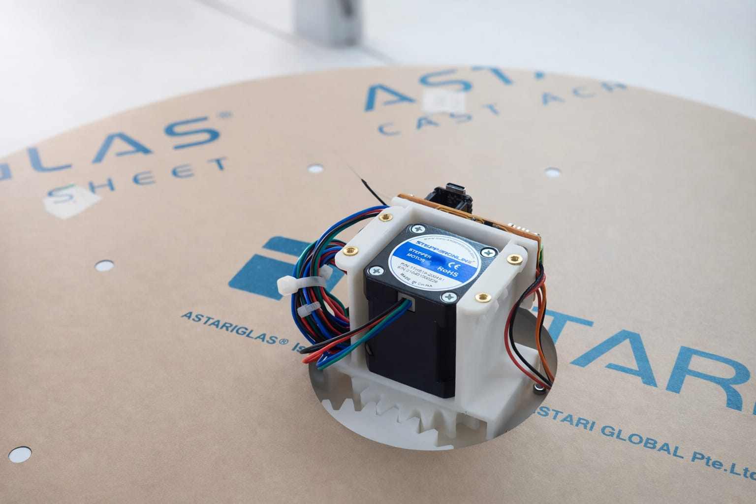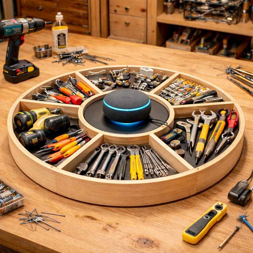 The key feature of this system is its voice-controlled automation using Alexa. When a user calls out the name of a tool or gives a command, the table automatically rotates to bring the required compartment within reach. This reduces manual effort and improves workflow efficiency.