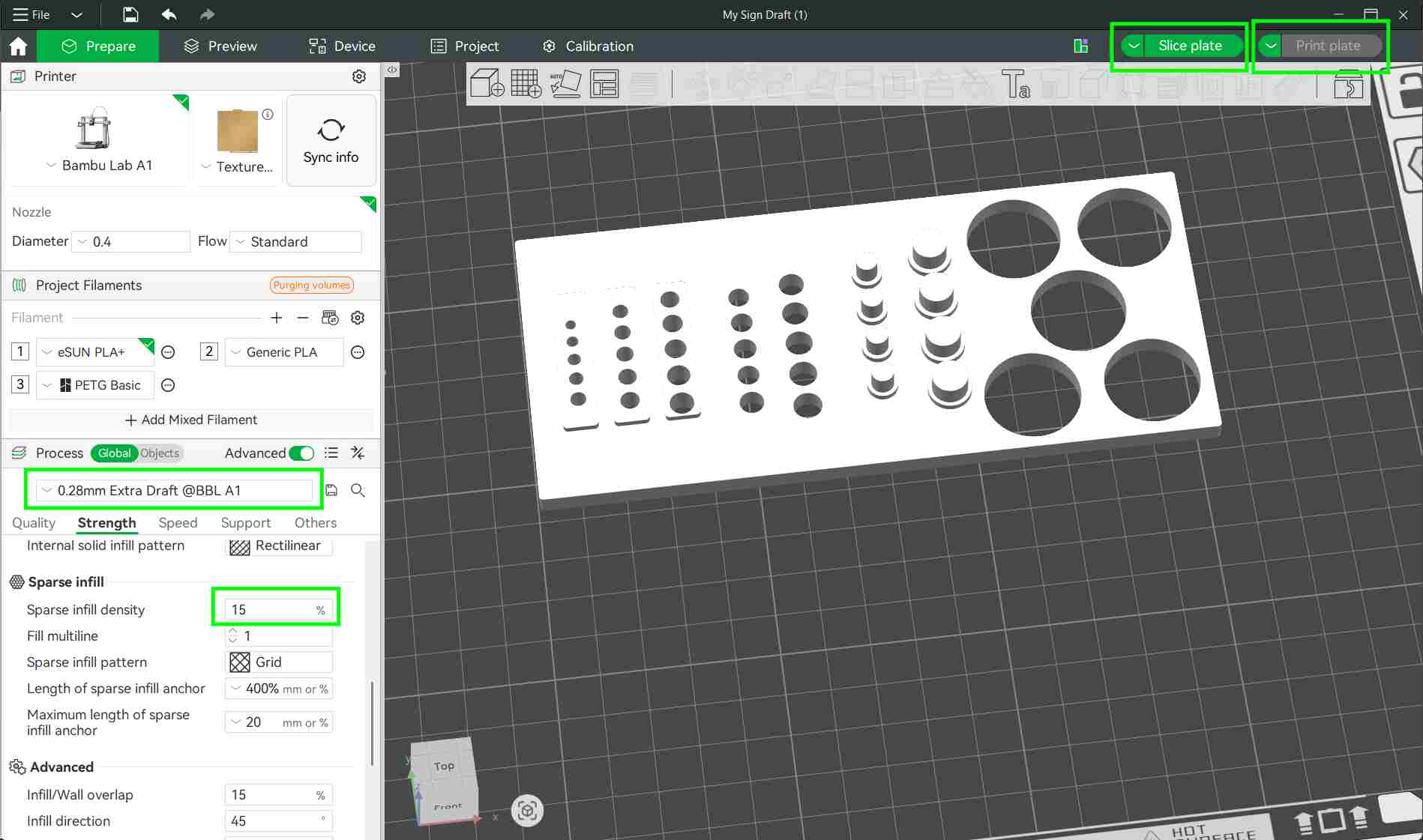 In Bambu Studio, the model was prepared for printing by setting the layer height to 0.28 mm and adjusting the infill density to 15%. These settings provided a balance between print speed, strength, and material usage.