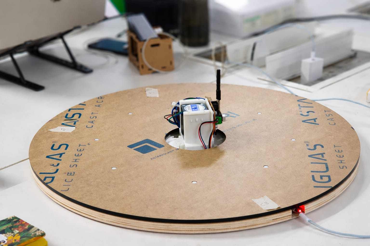 The Smart Tool Table is designed as a circular rotating workstation with multiple compartments to organize and store tools efficiently. Each compartment is dedicated to specific tools or components, allowing quick identification and access.