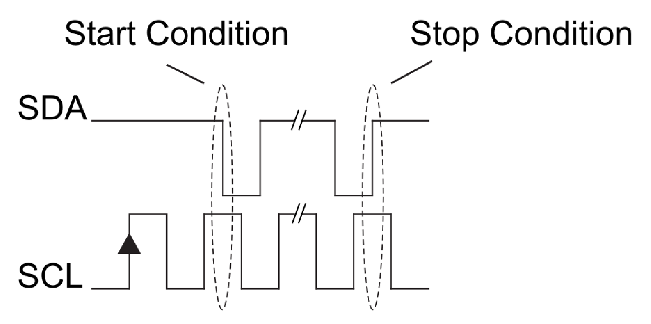 Start and stop conditions are generated by changing SDA while SCL is kept high: