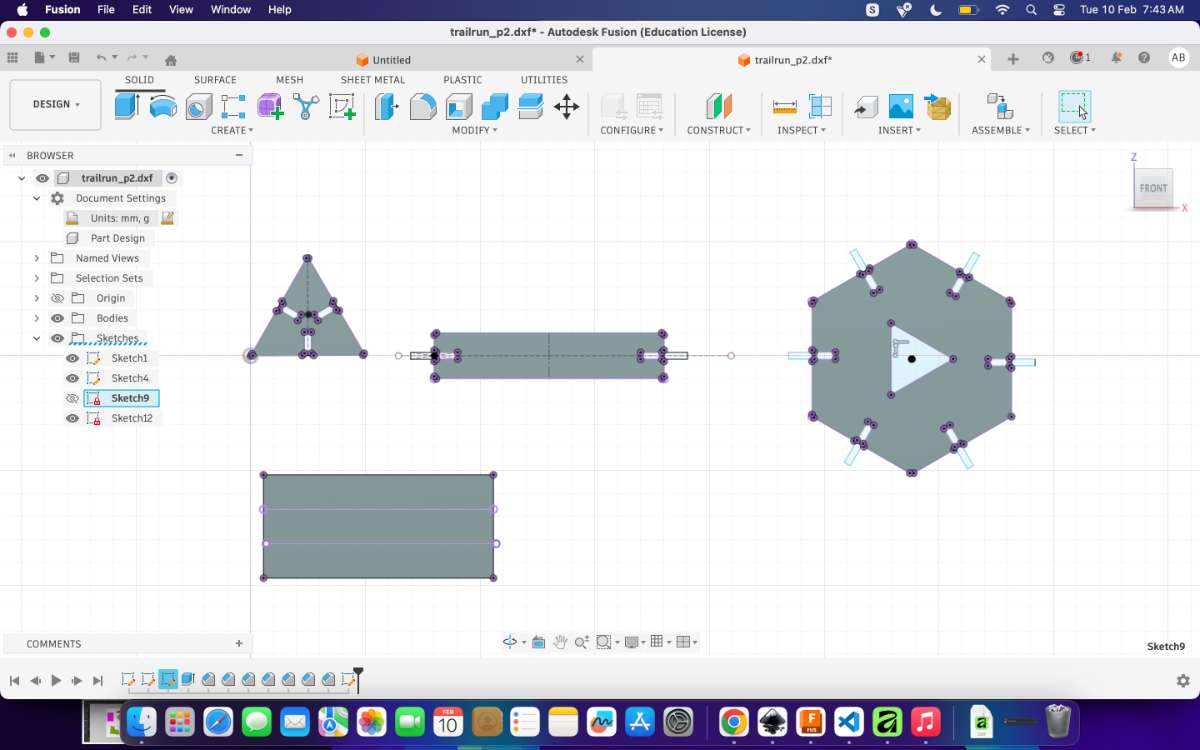Apart from that I have added parameters for many other dimensions like groove length, edge length for each shape, etc with the idea that I can change them at a later date without breaking the geometry every time. I then project the faces to a new sketch that we then export as a DXF file.