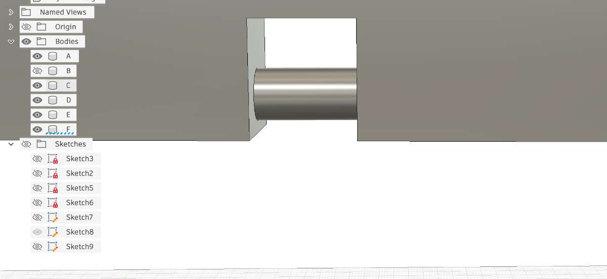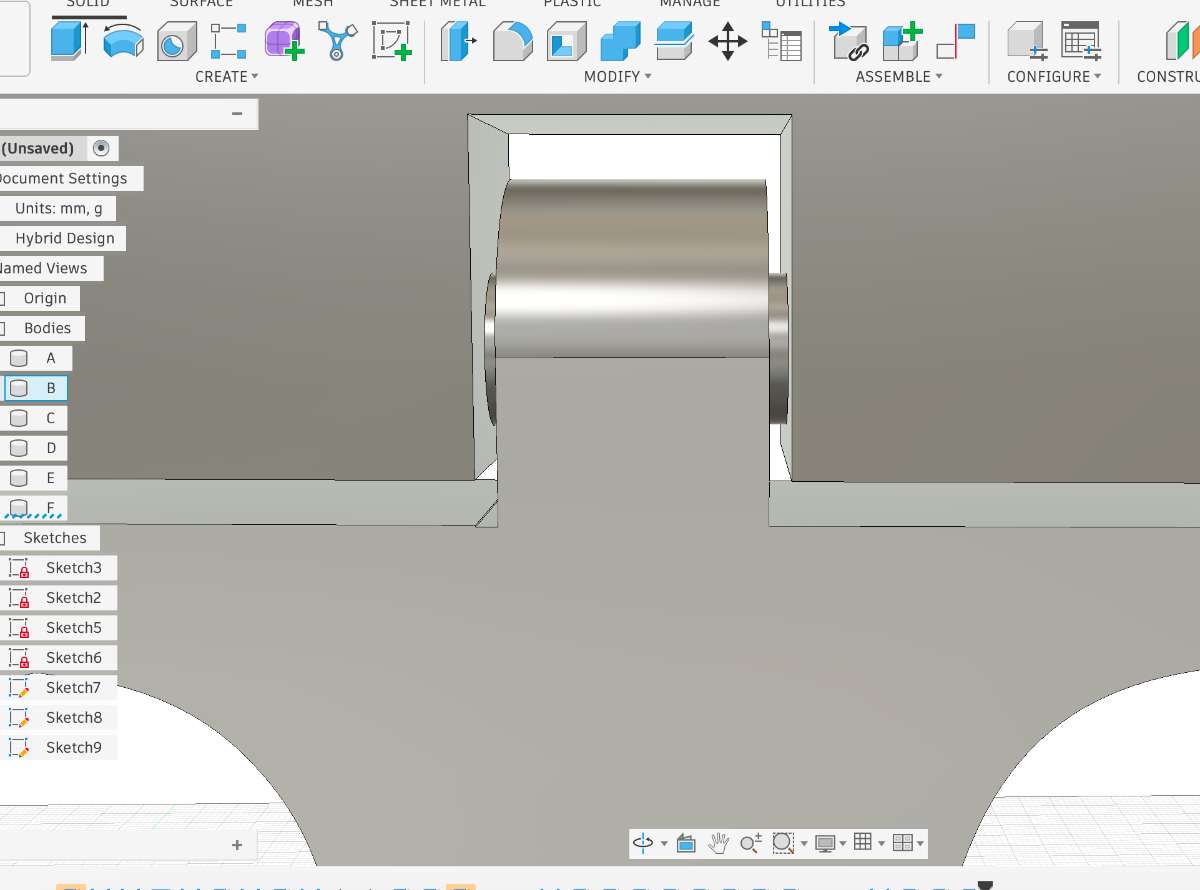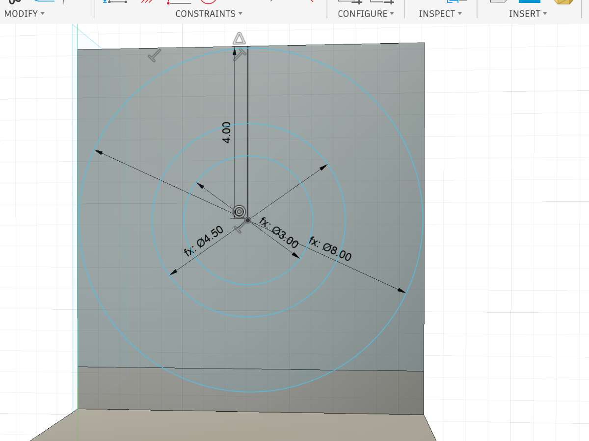 Then hide the body you're connecting to(in this case the upper body), and set view from the y axis. Draw a mid line of 4mm to be the centre point of your circle, then draw 3 circles or diameter 8mm,4.5mm and 3mm.