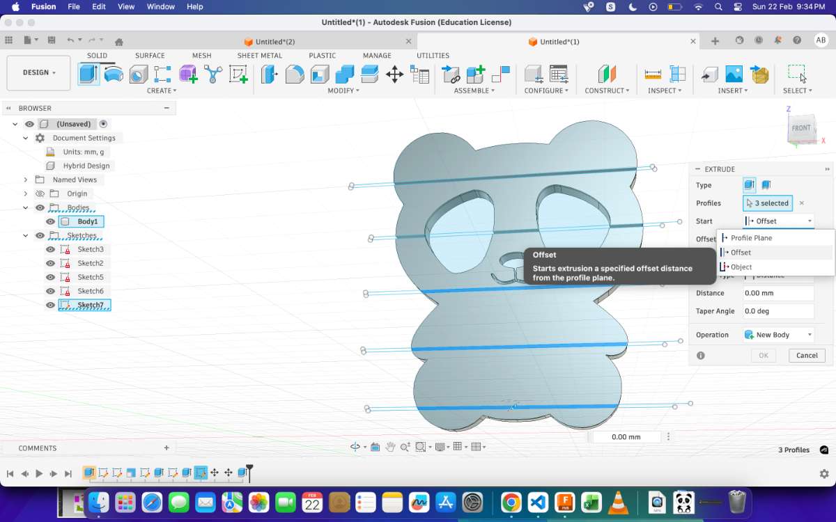 Now to form the cuts, select the extrude option from the top bar or simply press "E", switch the start section to Z- Offsetand then distance to -10mm or pull the arrow key back, this will cut the needed section.
