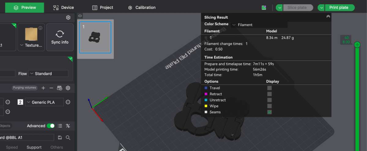 Then you go to slice plate, in which you'll be able to get an overview of how much time the print will take and the type of fill and the direction or the manner in which the print take places.For me it takes around 1h7mins