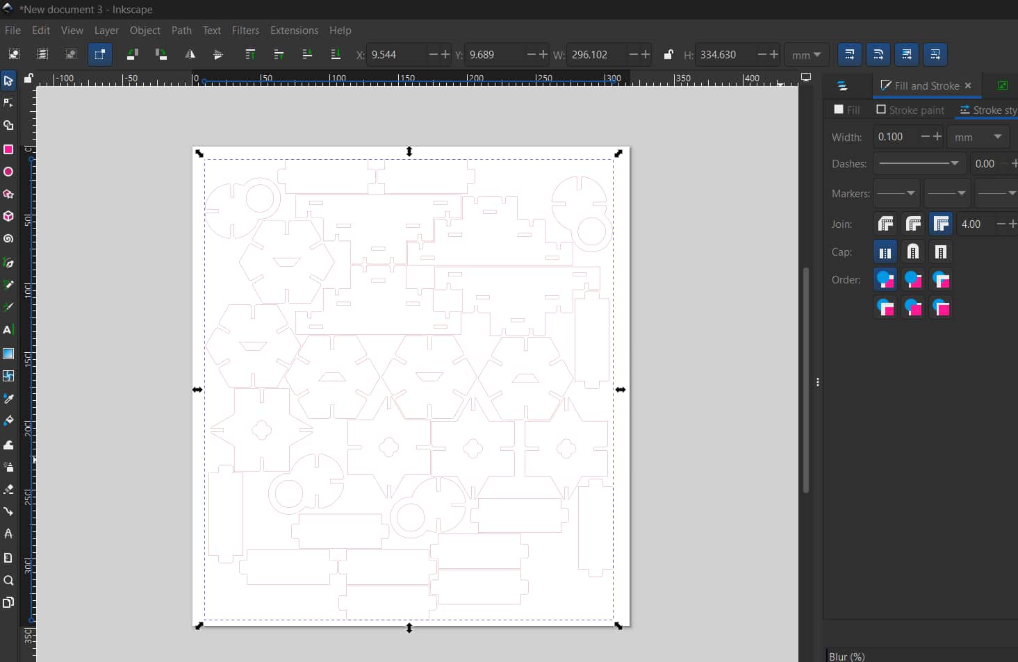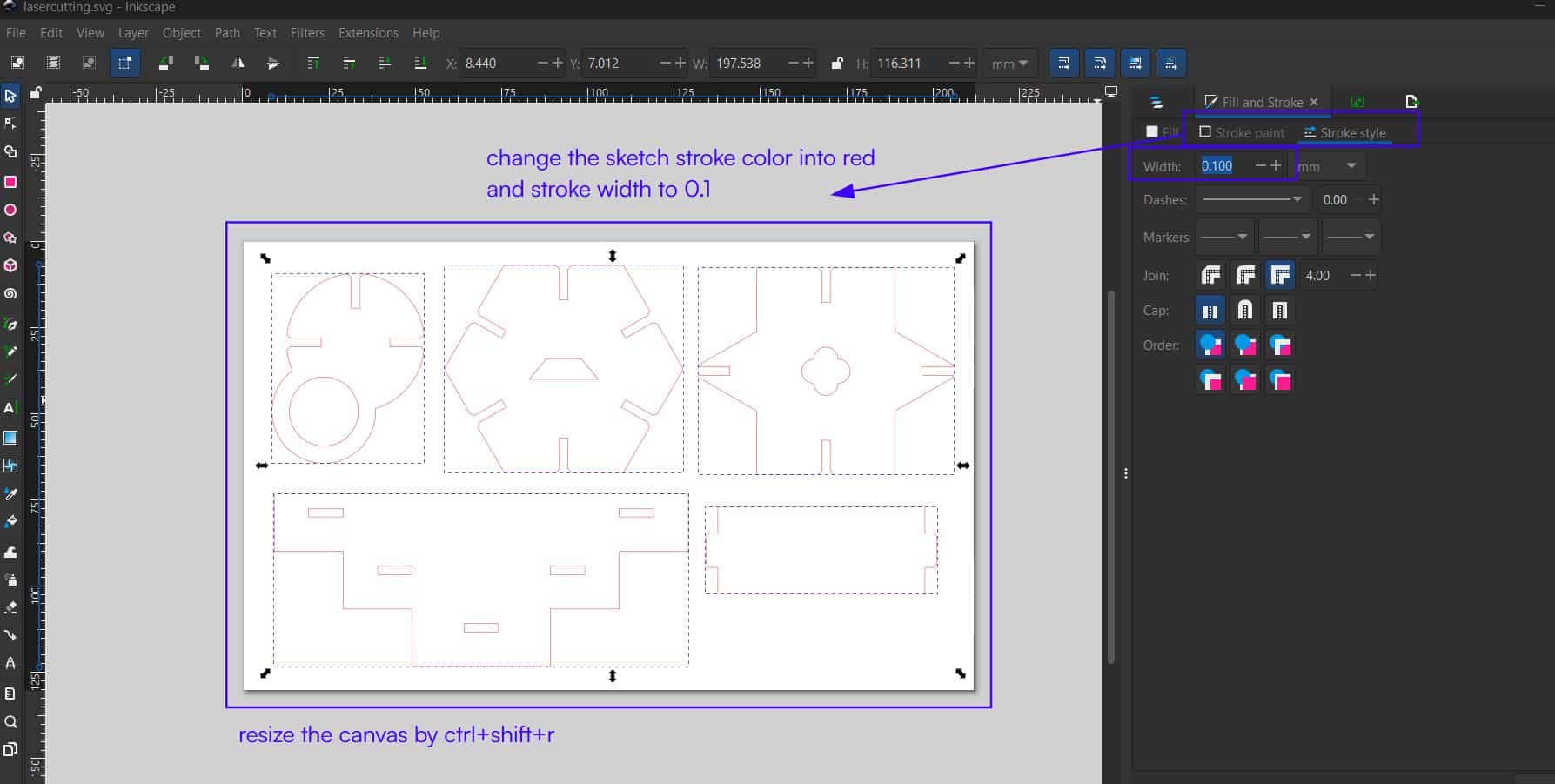 change the stroke color to red and set the stroke width to 0.1 mm, as in the machine's (Trotec laser cutter) material database settings where red color is set for cutting.