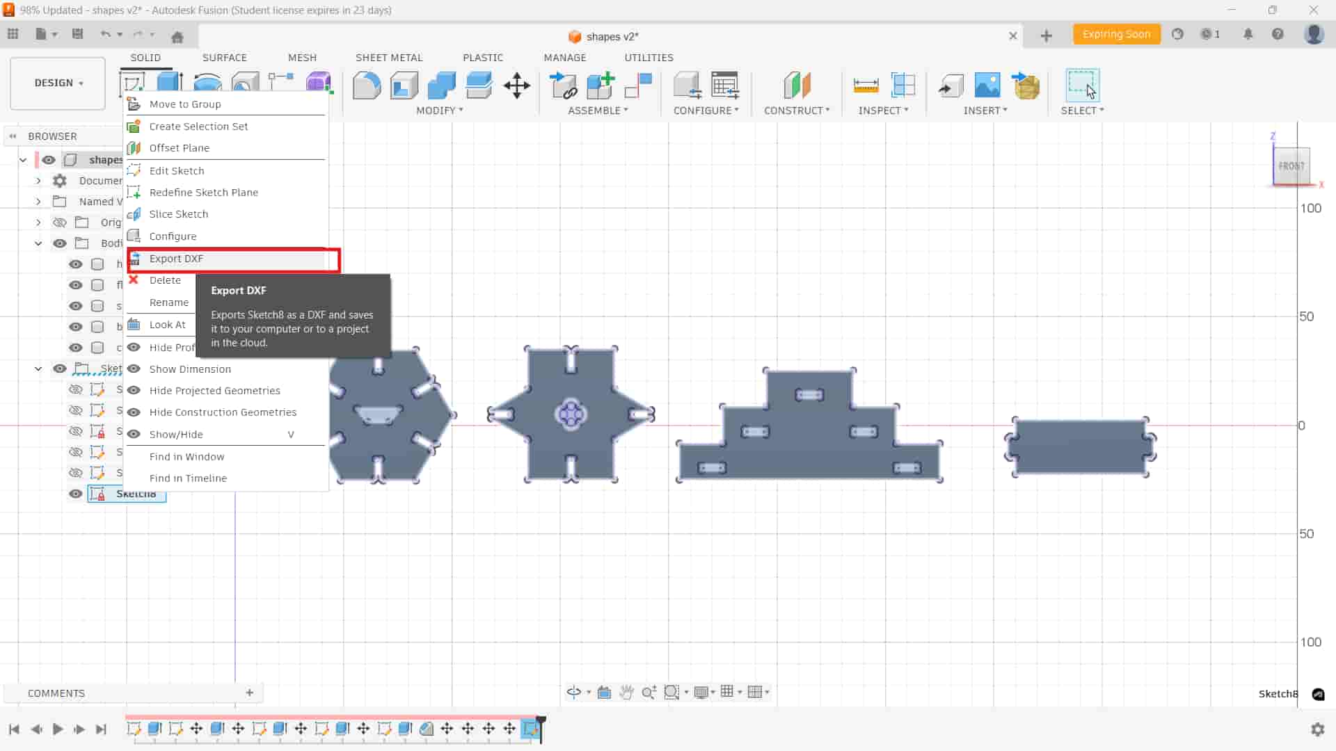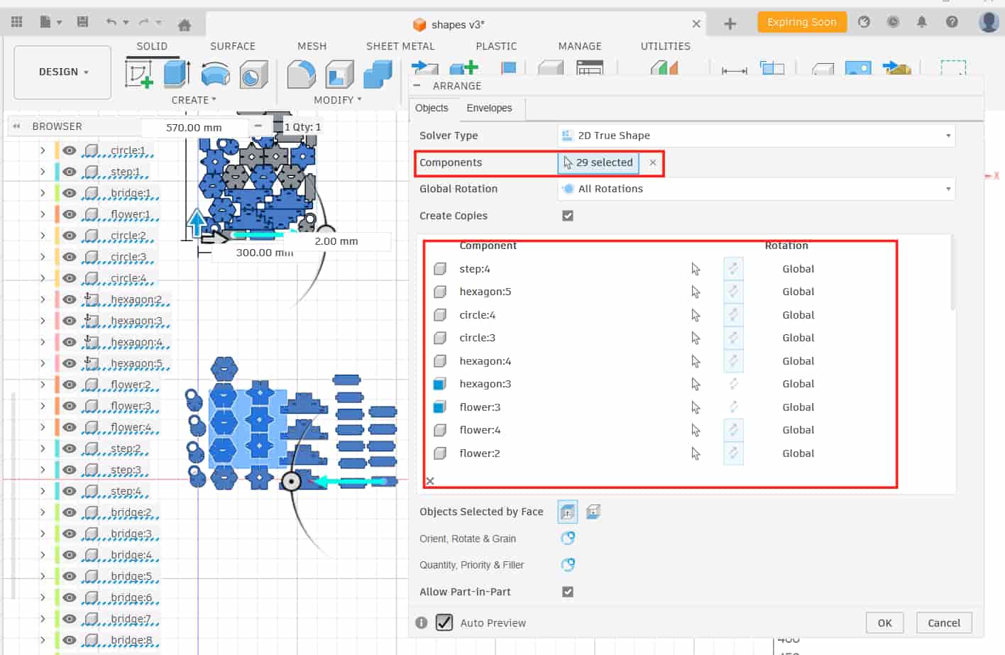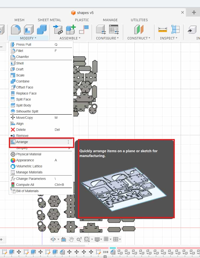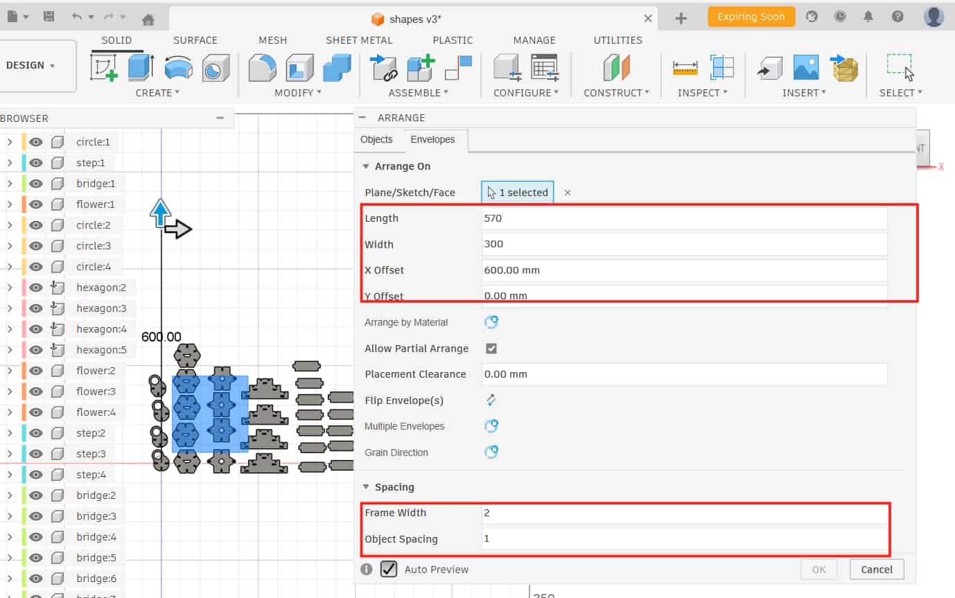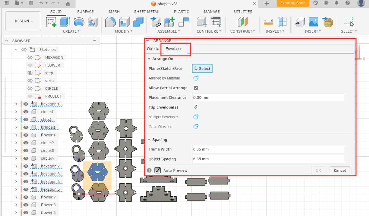 After arranging, I created a new sketch, projected the outlines of the arranged components, and exported the sketch as a DXF.