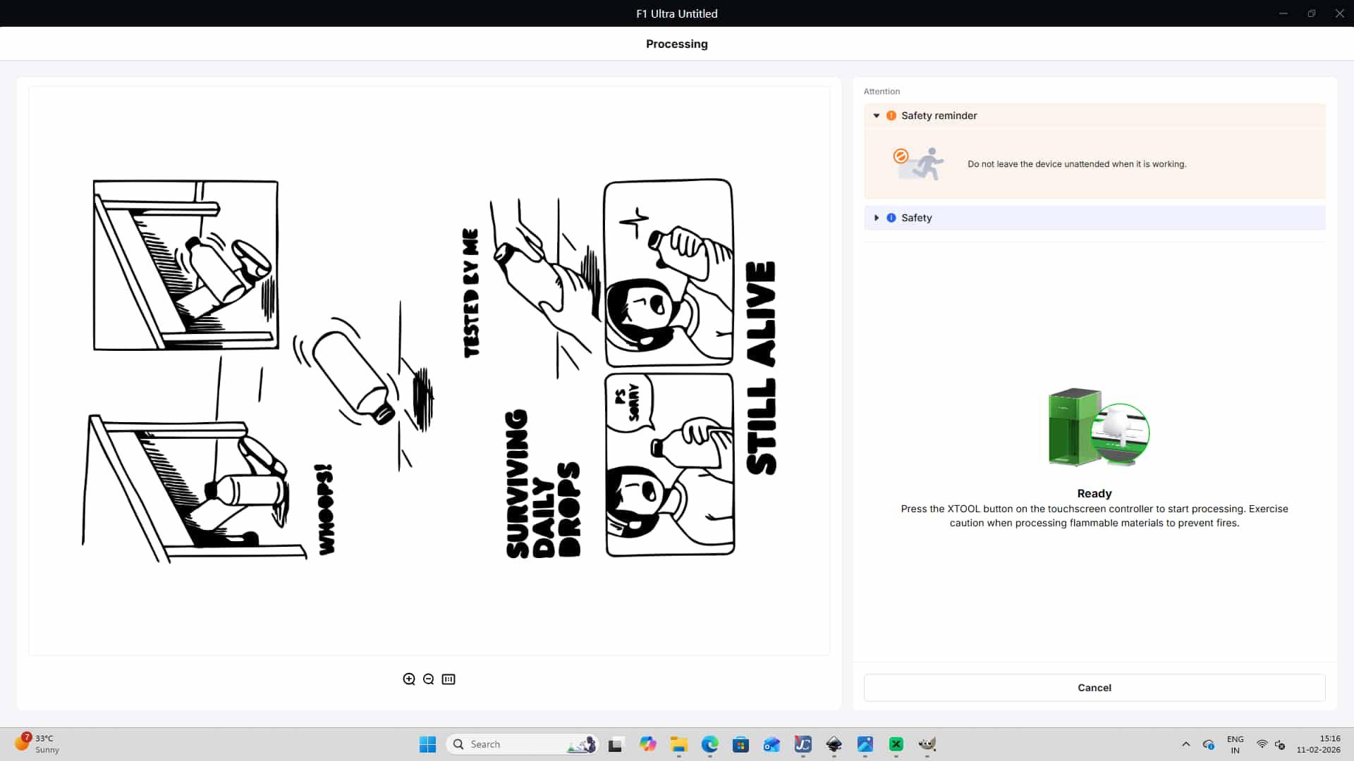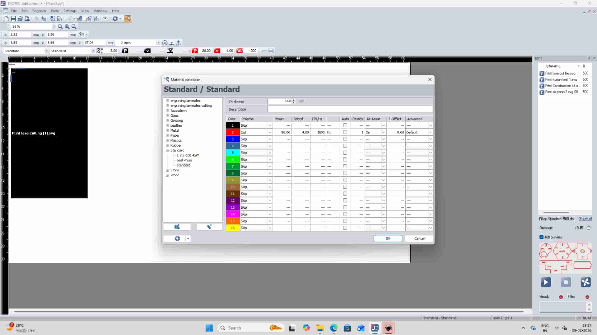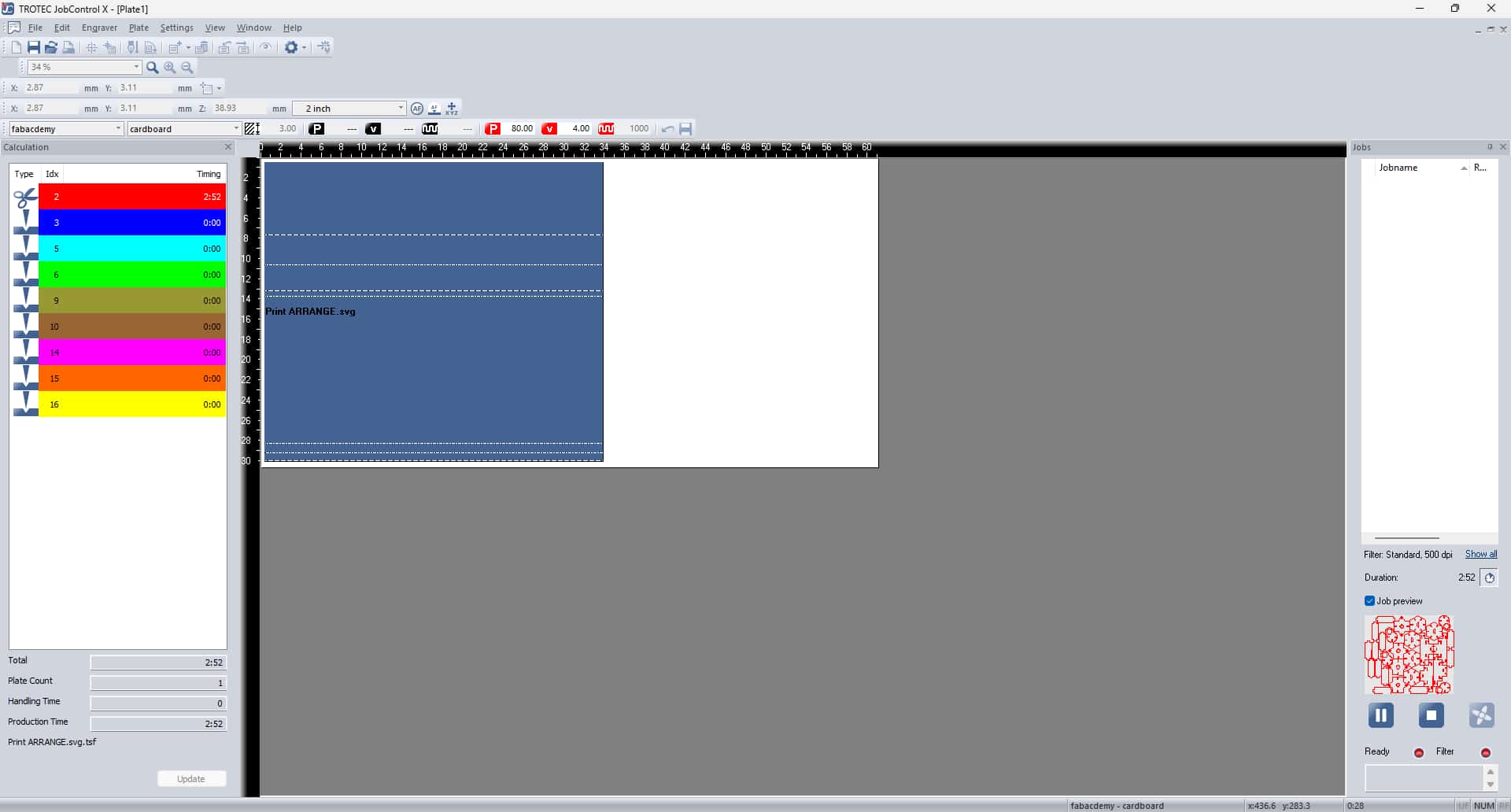Once everything is set, press the Ready/Play button in JobControl to send the job to the laser cutter and start cutting.