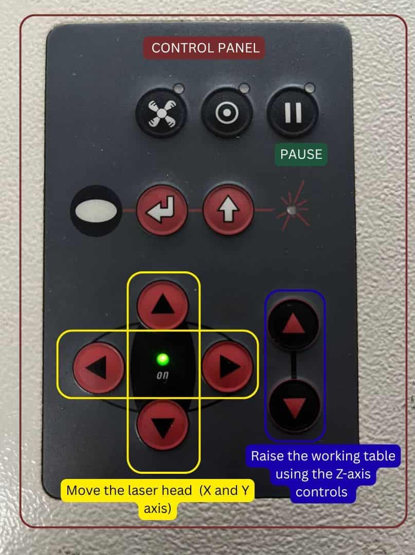 Move the laser head to the desired starting point on the material using the cursor keys (X and Y coordinates).