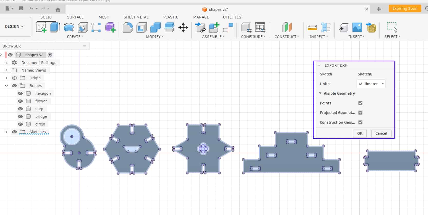First i opened the design in Fusion. All my parts were in bodies, so converted them into components, and then copied and pasted each component as needed. I didn't actually have any fixed requirement for the shapes — they are mostly random, and i wanted to challenge myself to see what all I could construct from them. There is one more thing once you done the minimium requirement of assisgnment, the remaining time you can explore.