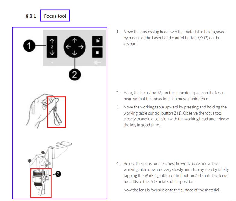 Raise the working table using the Z-axis control until the focus tool just touches the material