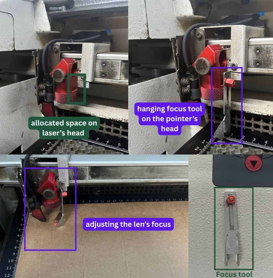 Go to the laser cutter machine. Hang the focus tool in the allocated space on the laser head.