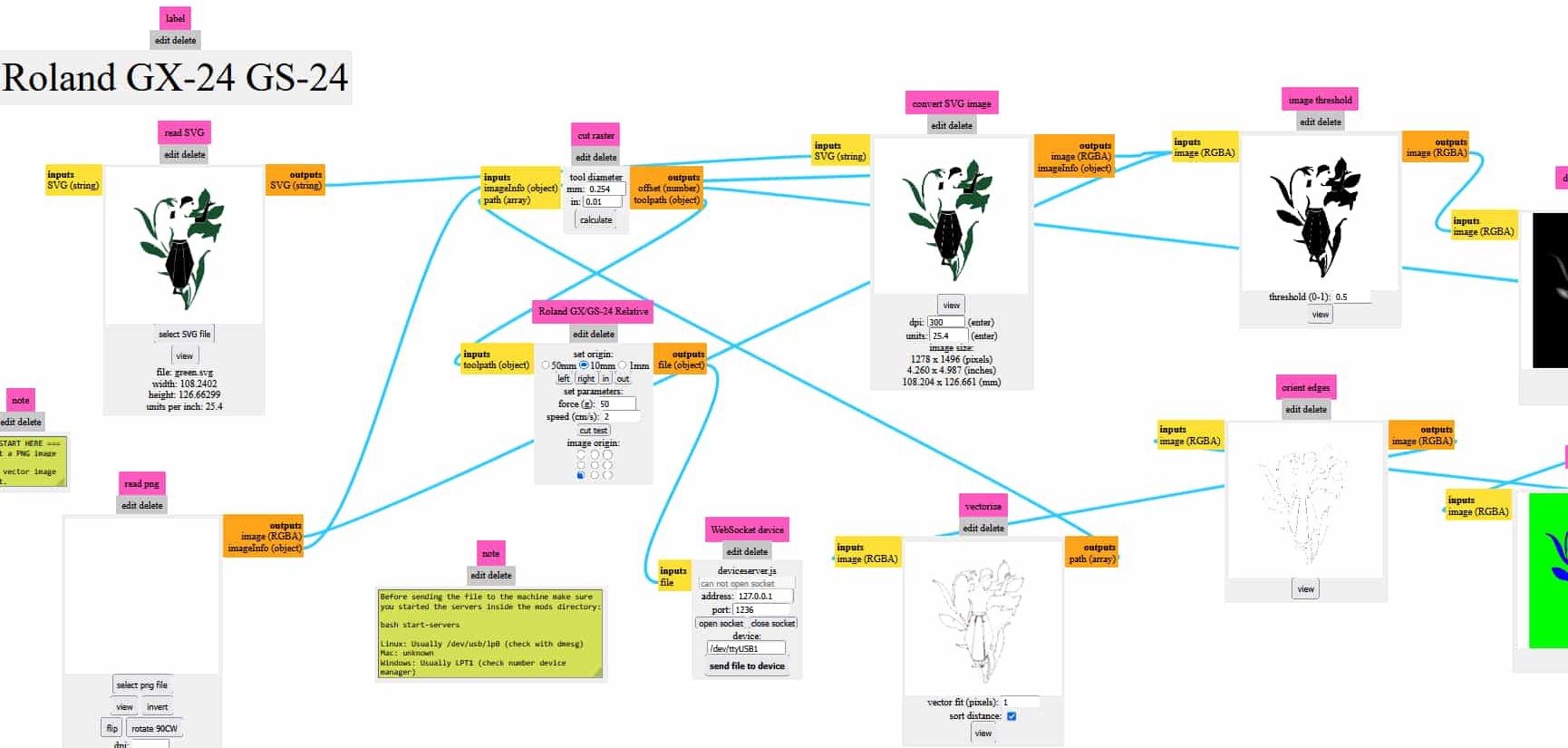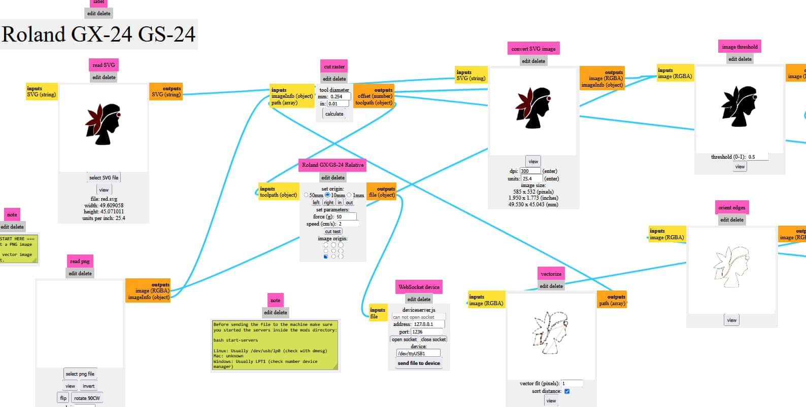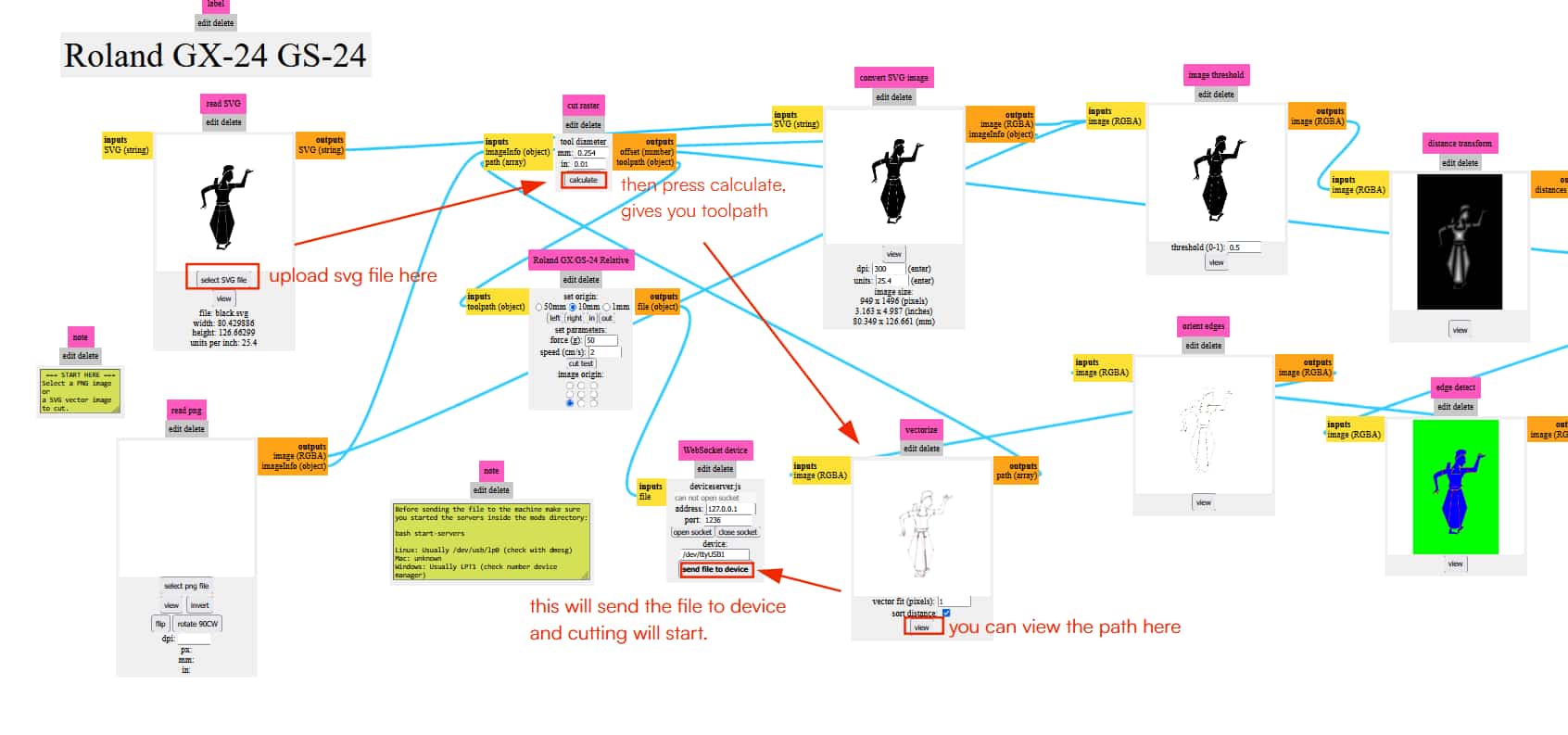 “select svg file”>> then press calculate which calculates toolpath>> can check the path using “view”>>”send file to device”