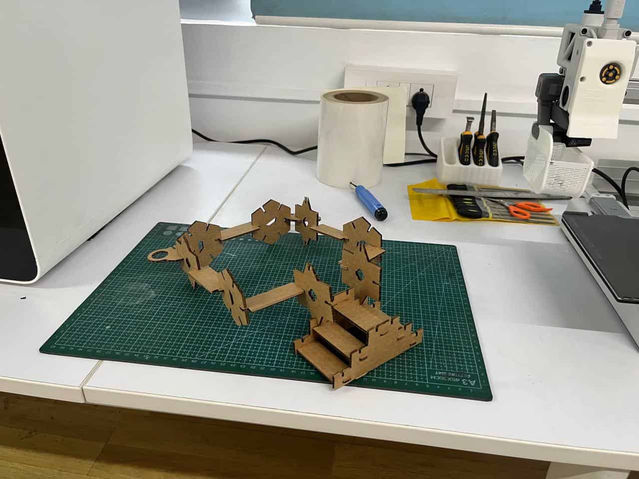 The kit was created with different joints so that the parts can be assembled without glue and can be rearranged to build different structures.