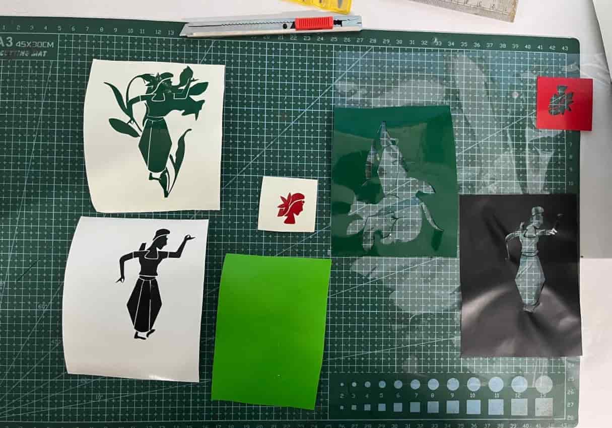 The excess vinyl is then removed by tweezers, blades, leaving behind the desired design. For applying the design to a surface can be done using heat press or adhesive.