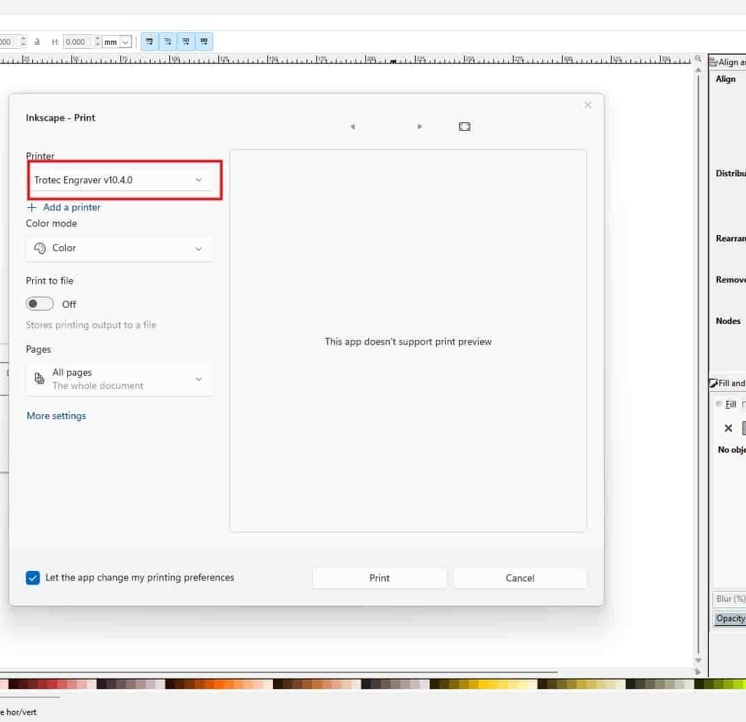 Open the file in Inkscape on the Fab Lab PC and press Ctrl + P to print. Select the Trotec Engraver, which opens the file in Trotec JobControl software.