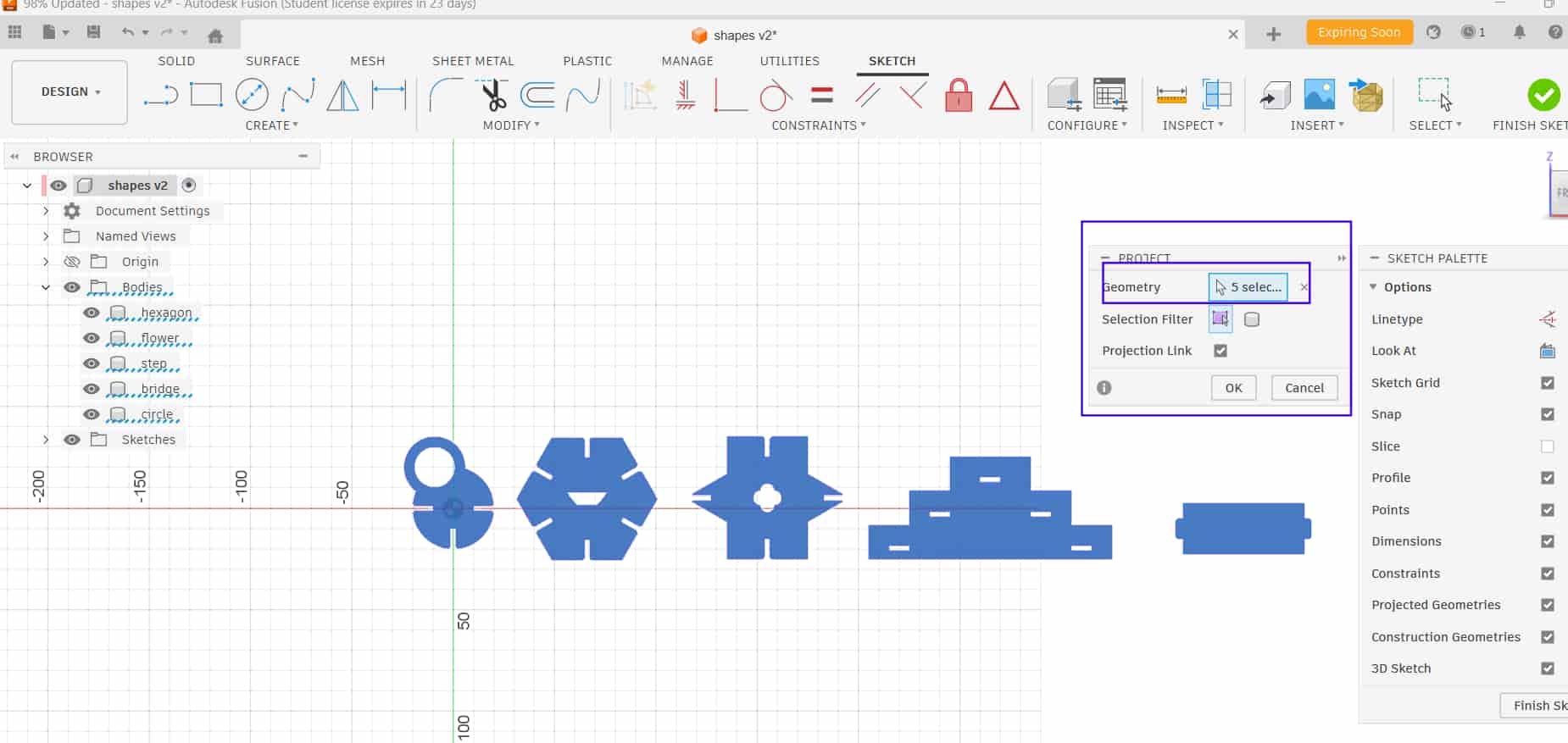 In Fusion 360, I used Create Sketch to construct the shapes and defined the sketch using parametric dimensions. Tools such as polygon, line, rectangle, circle, offset, and mirror were used, along with constraints, to fully define the sketch.