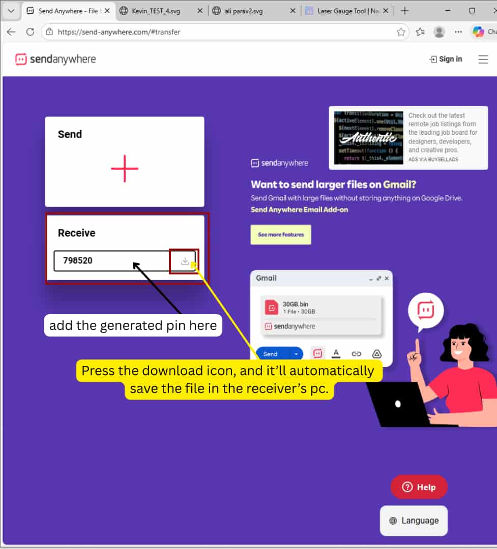 Then, on the receiving computer, enter the same PIN code to receive and download the file.