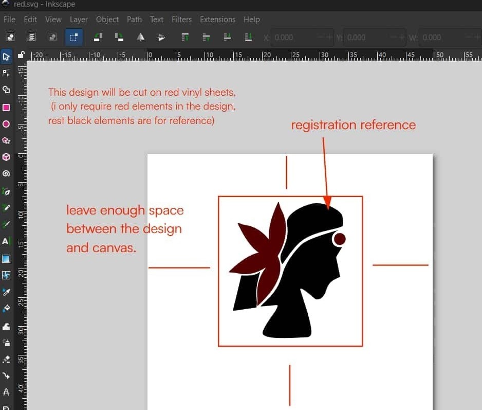 I also left some margin around the design, because if the design is too close to the edge, unwanted gaps may appear while generating the cutting paths. Registration reference were left in each file for accurate alignment while layering the colors. Finally, I saved the files in SVG format for cutting.