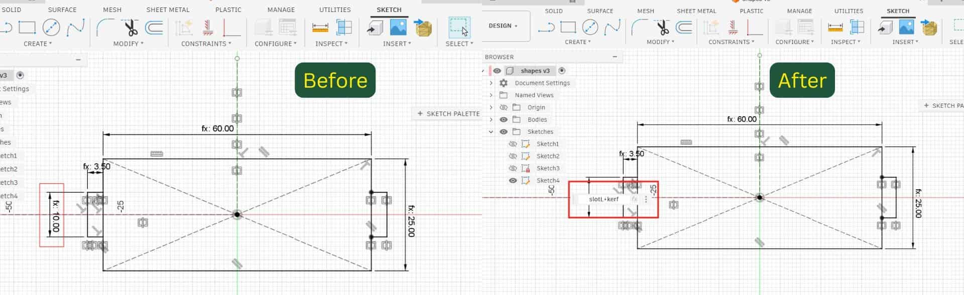 Since I defined the length parameter as slotL, the slot on the step component became slotL - kerf, and the tab on the strip became slotL + kerf.
