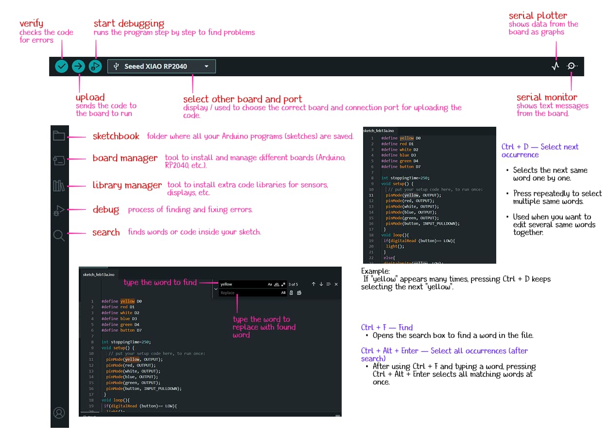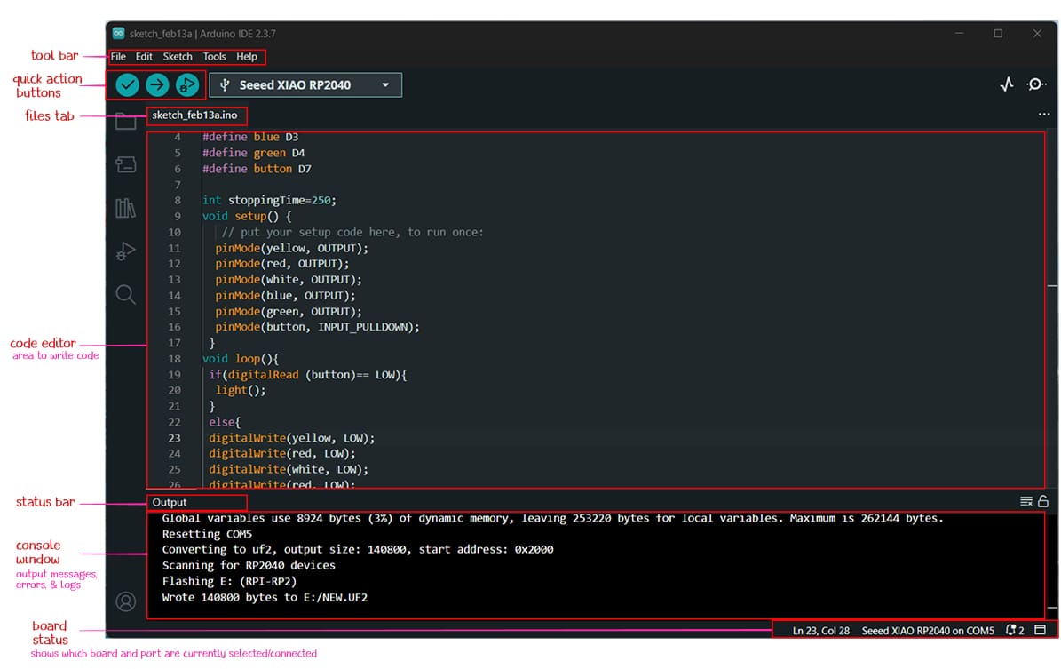 In the Blink example, the constant LED_BUILTIN did not work with the XIAO RP2040 because this board does not use the same built-in LED pin definition as some Arduino boards. By checking the XIAO RP2040 pin-mapping in the Seeed Studio wiki, I found that the onboard RGB LEDs are instead: