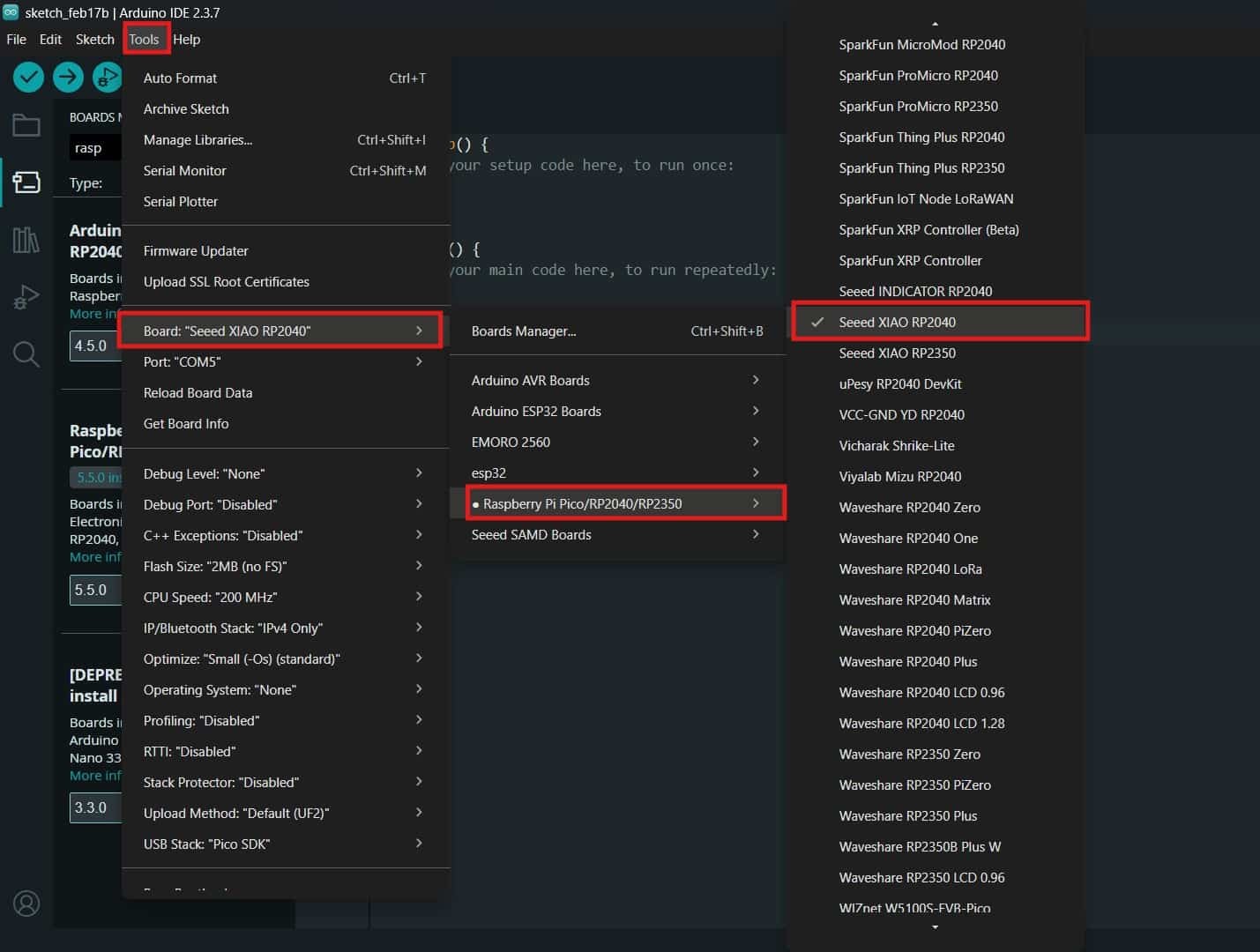 After adding the URL, Boards Manager >> searched for "Raspberry Pi Pico/RP2040", and installed the package. This package includes support for the Seeed Studio XIAO RP2040 board, Tools >> Board >> selected the required board from the board list.