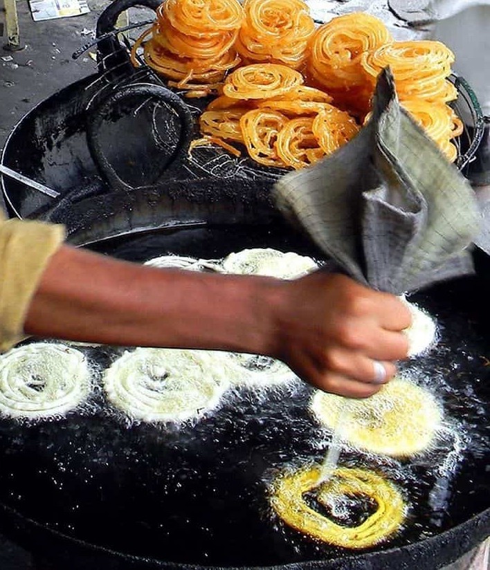 Or even like jalebi, where the batter comes out of a nozzle and is drawn into circular patterns to form the shape.