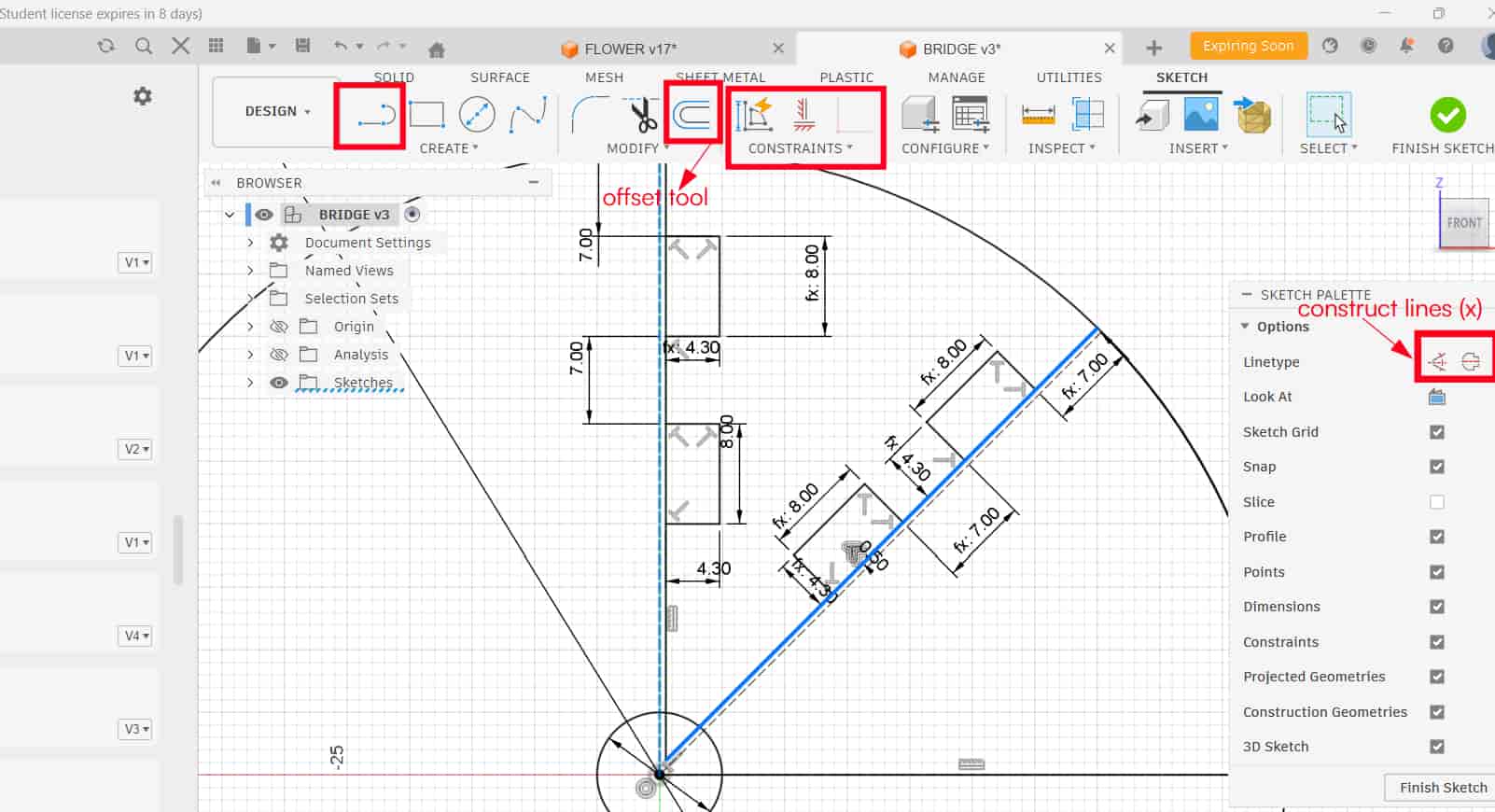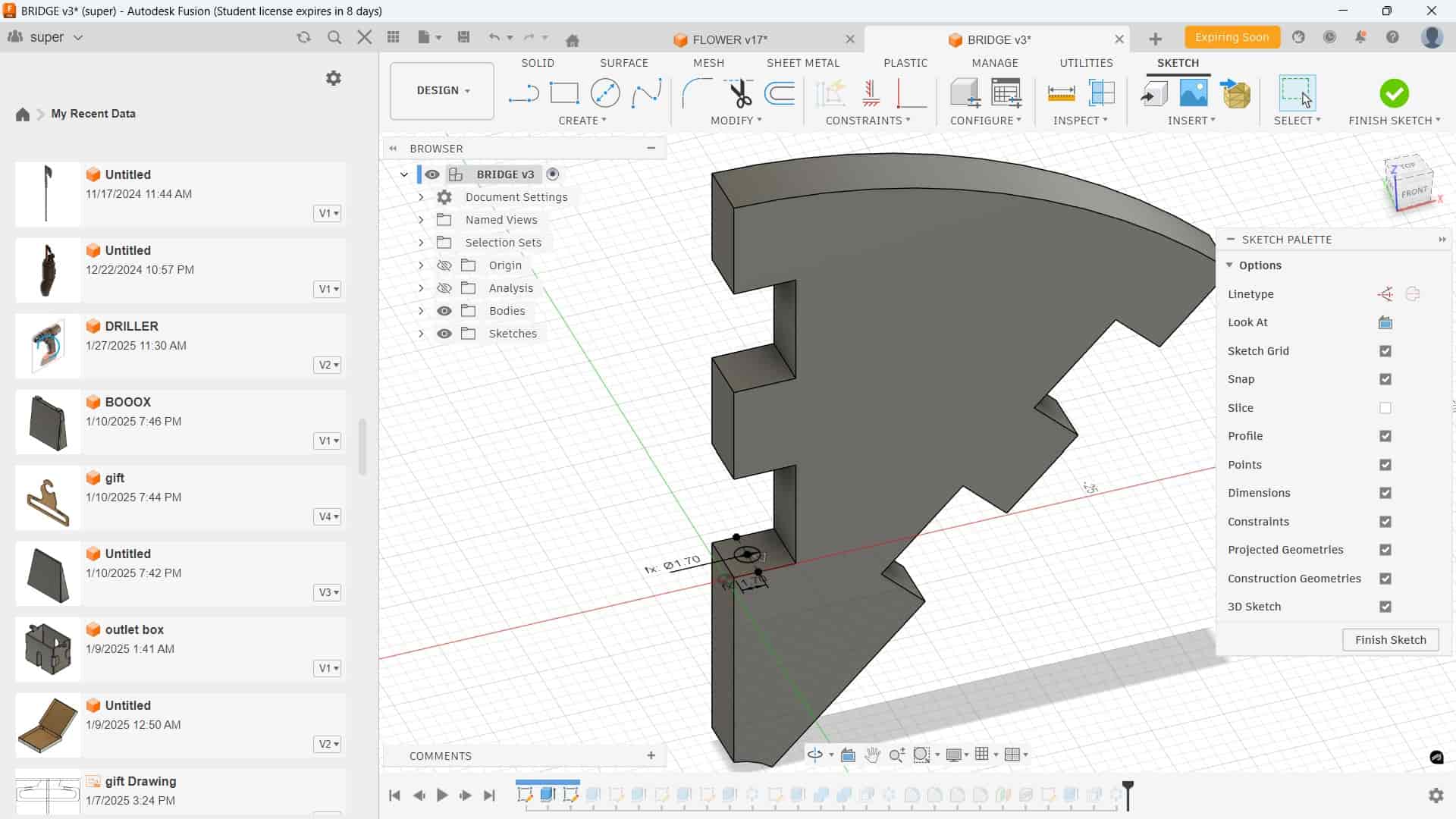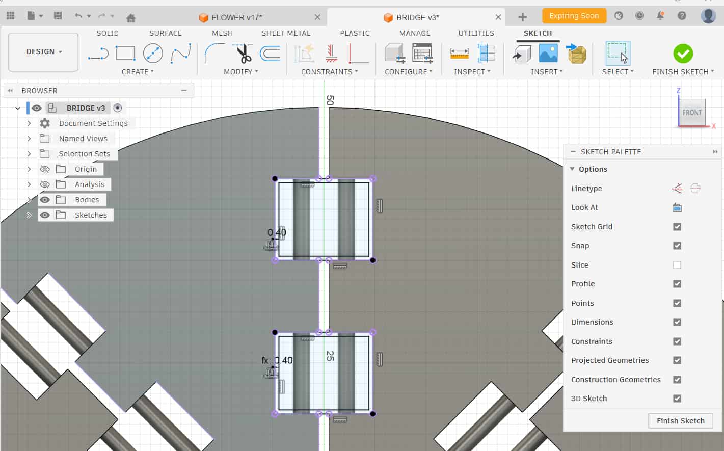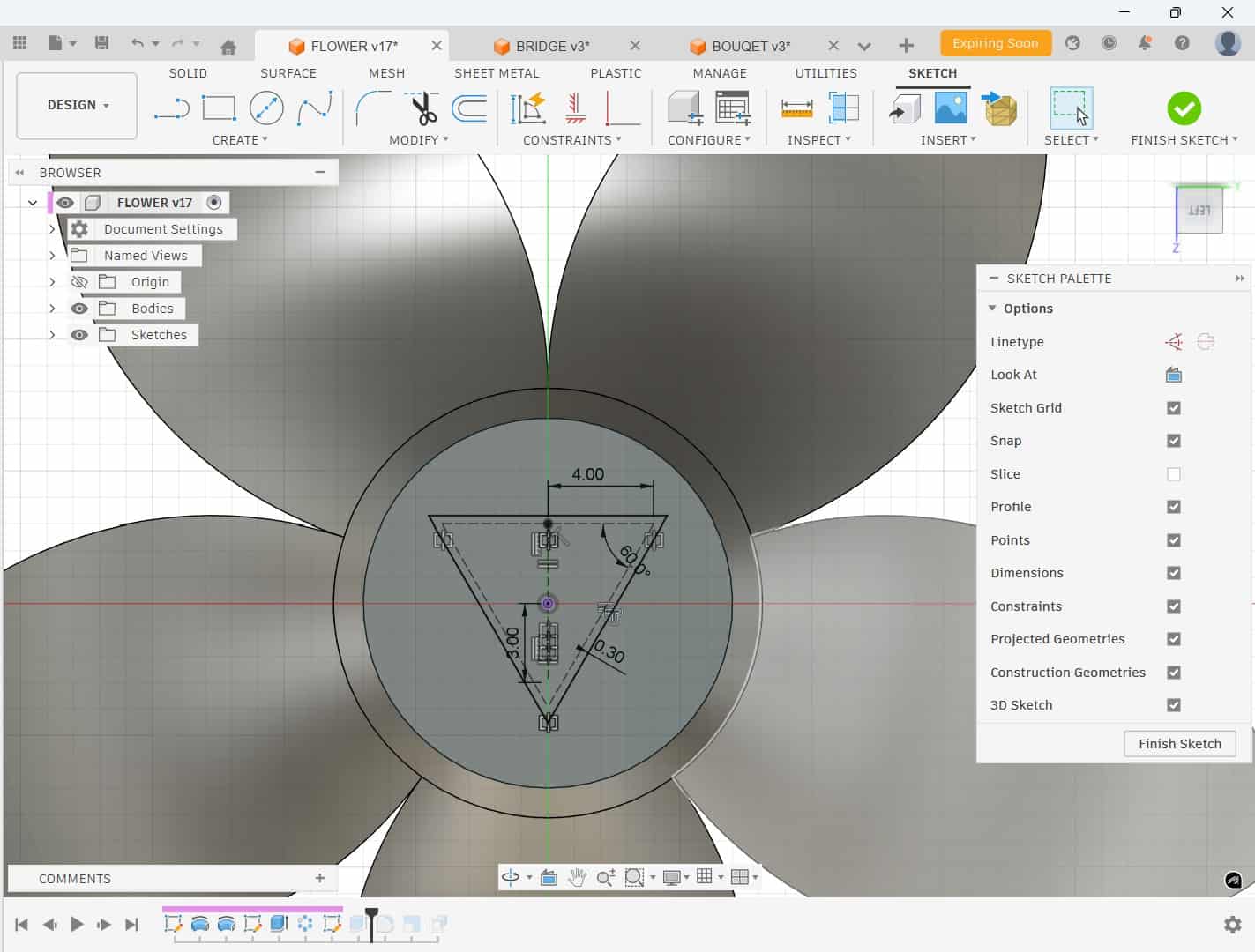 Then created sketch on the construction plane, projected the hole from the flower base and flap curve using project tool, and positioned hole sketch properly on curve projection.