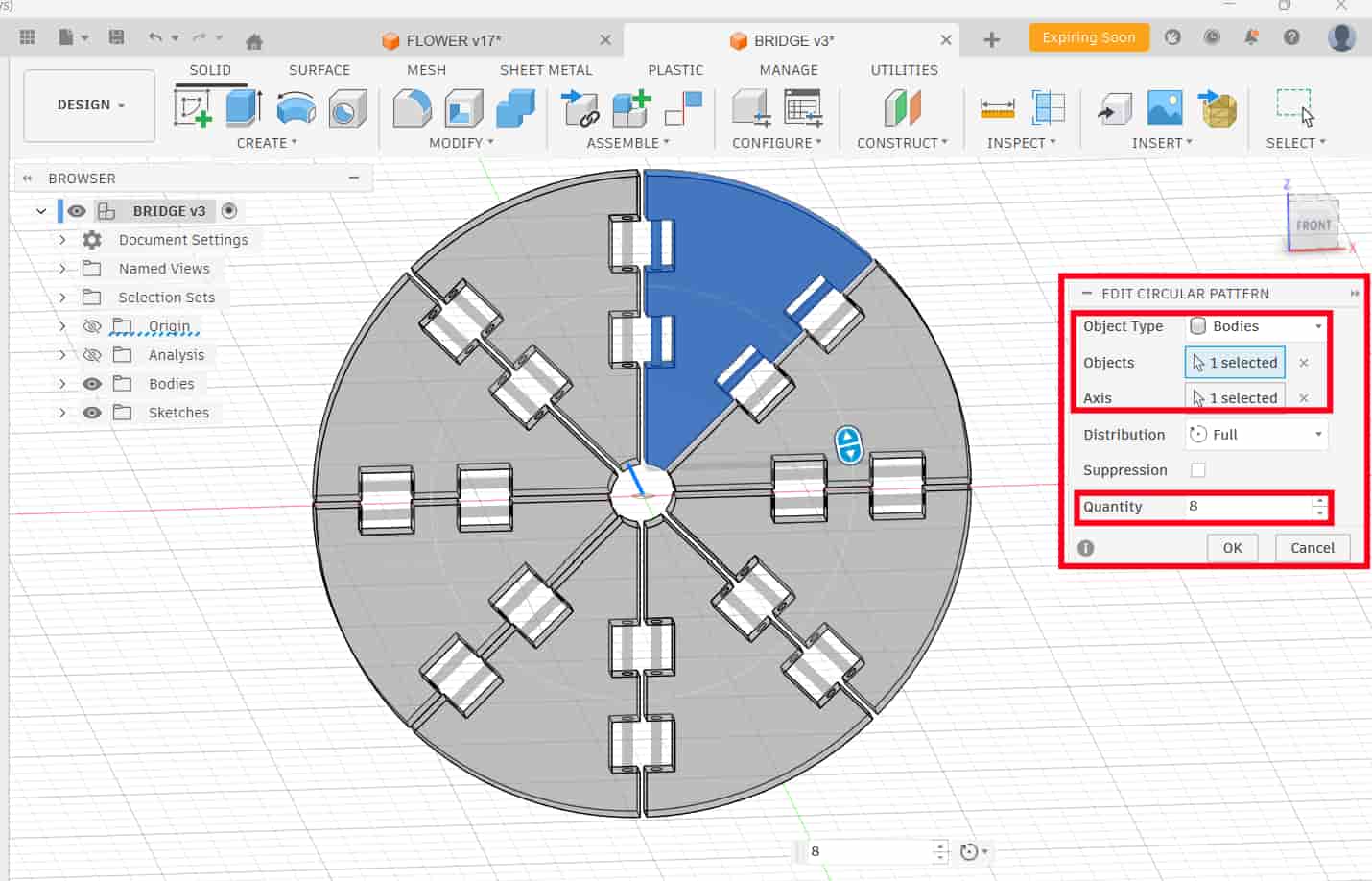 used to duplicates a body evenly around an axis. selected the flap body, chose the Y-axis as the rotation axis, and set the quantity to 8 to create 8 flaps arange in circular form.
