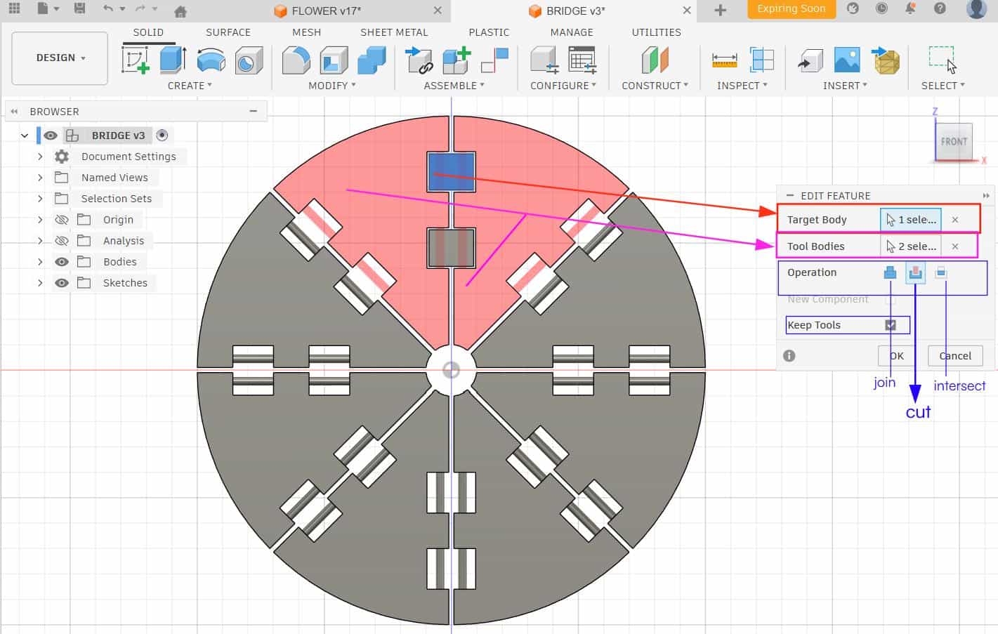 I selected the hinge body as the Target Body(the body to be modified) and the flaps as the Tool Bodies.