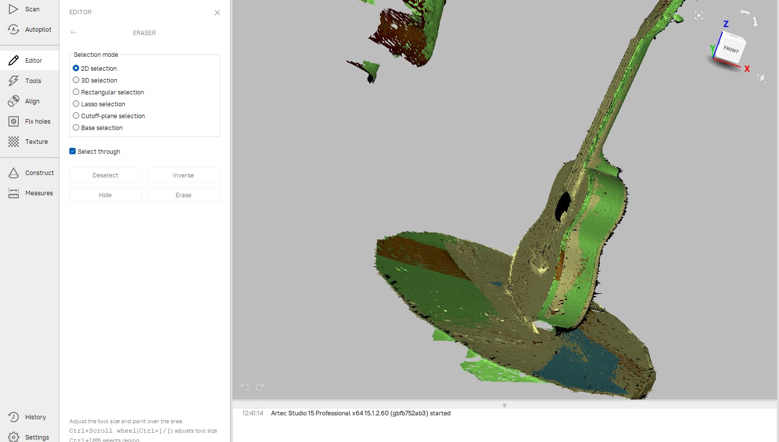 The scanner had trouble capturing the geometry of the metallic tuning pegs and strings, resulting in incomplete data in those regions.