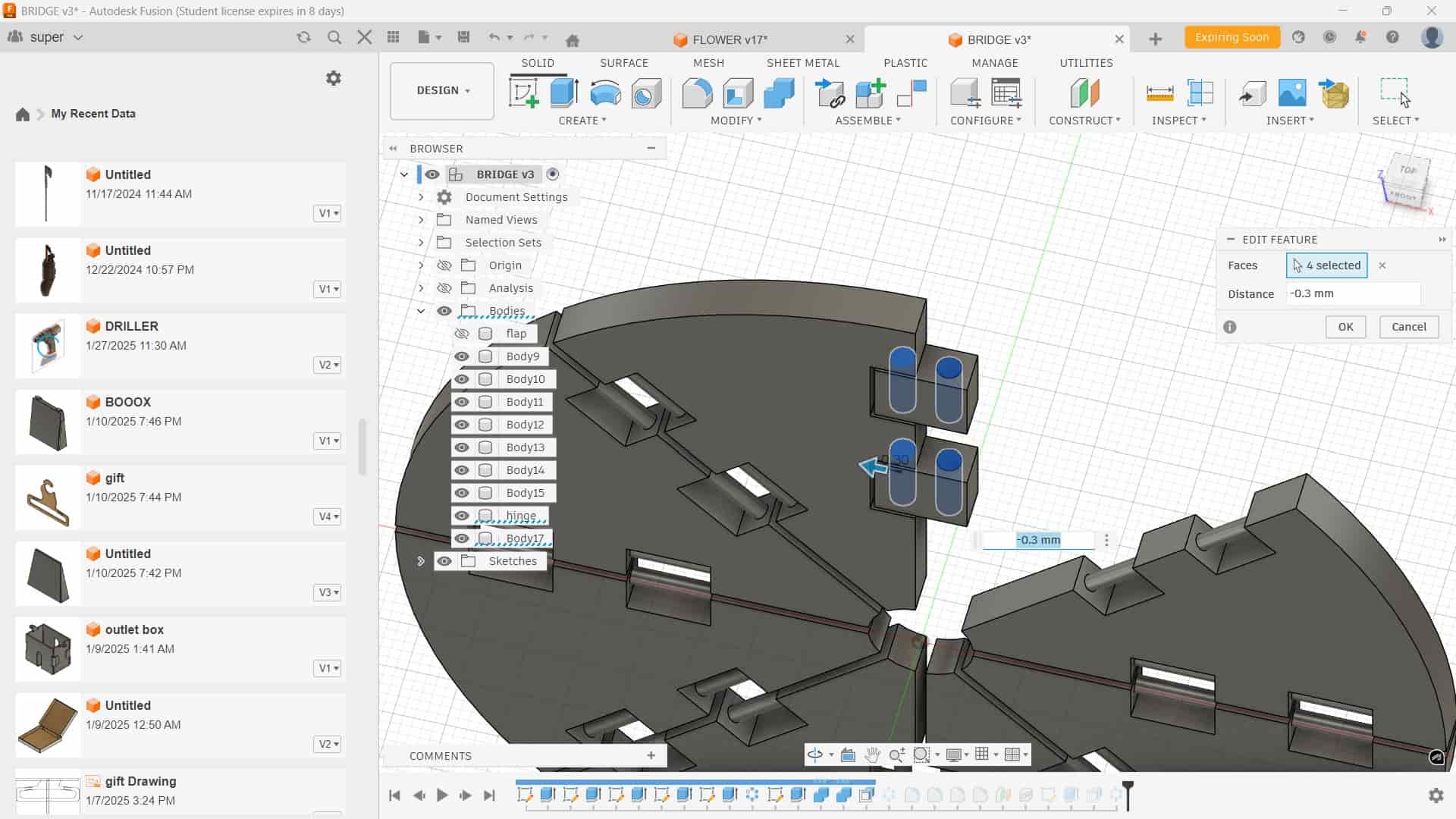 For the hinge pins, I finalized a diameter of 1.7 mm after several iterations. I tested the movement using Joints and also the Move Tool inside the software. Each flap had four hinge pins, and they were joined to the flap body.