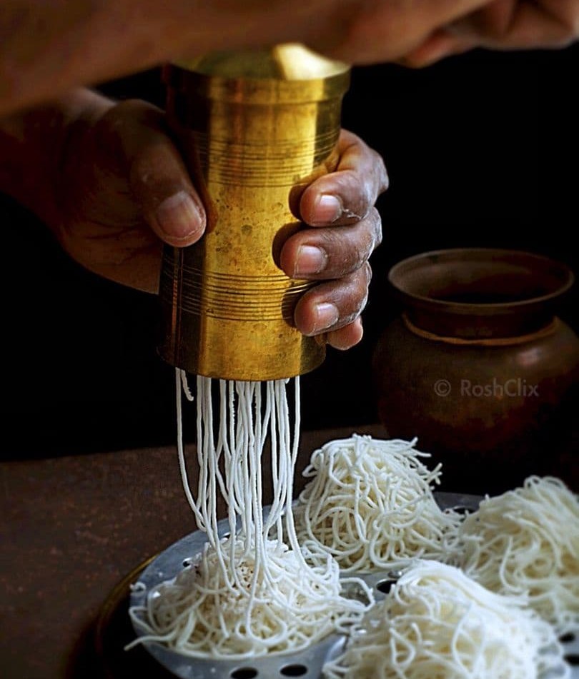 Like in Kerala households, when making noolputtu / idiyappam, the dough is pressed through a mould and comes out as thin strands. Mount them on the idiyappam maker,
