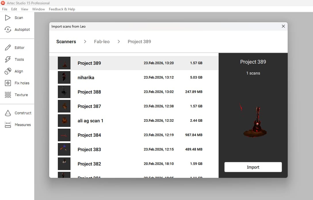 For importing, select import from leo >> scanner >> select the project. software provides various tools for post-processing, including: